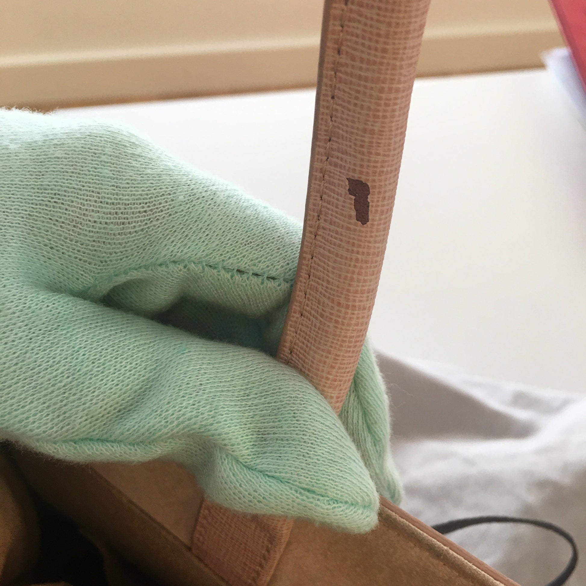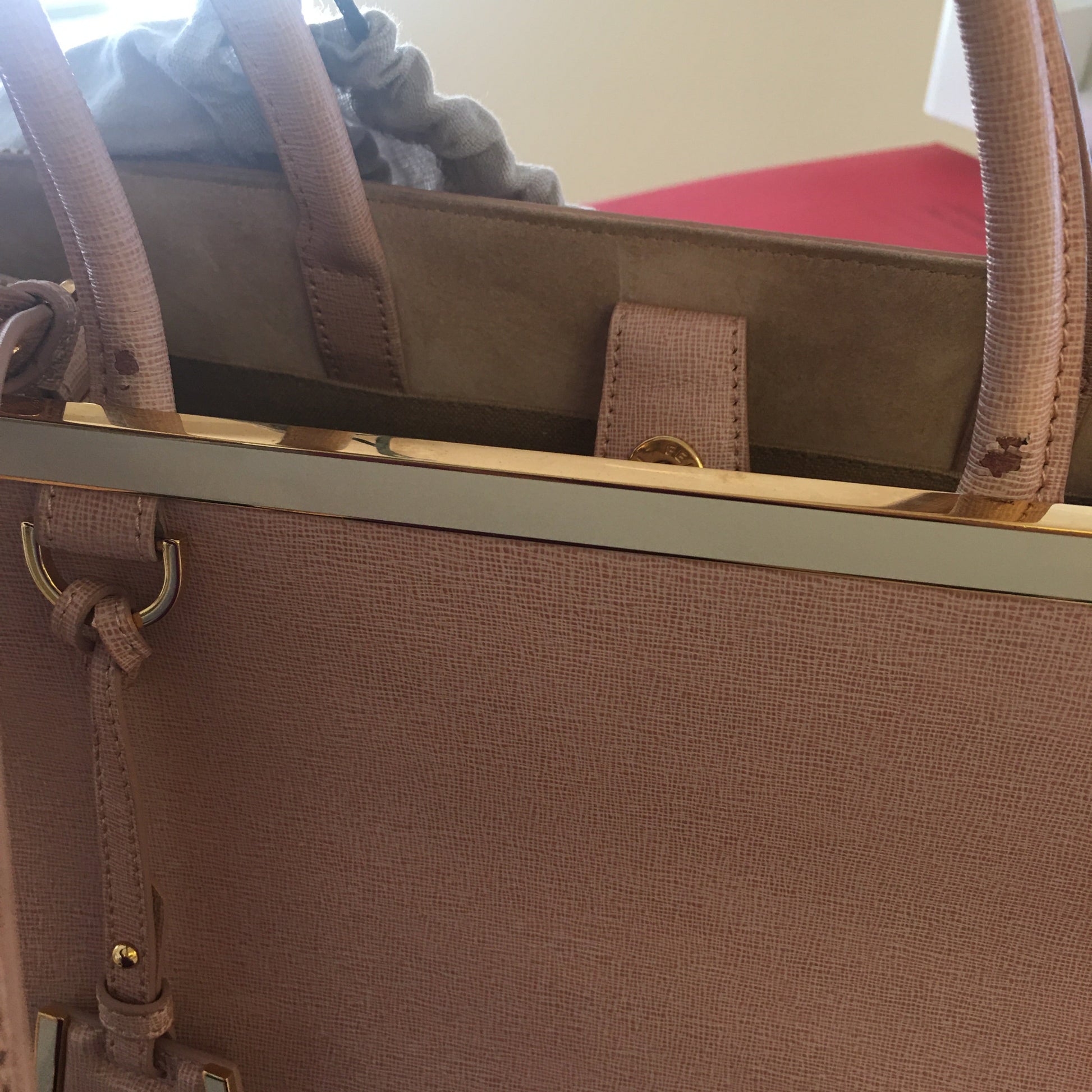 Inside, the beige toile lining is clean