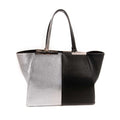 Details: Black and Sliver Metallic Leather / Silver-Tone Hardware / Dual Rolled Handles / Protective Studs at Base / Black Suede Interior Lining / One Compartment / Dual Flat and One Zipper Pockets at Inside / Snap Closure at Top