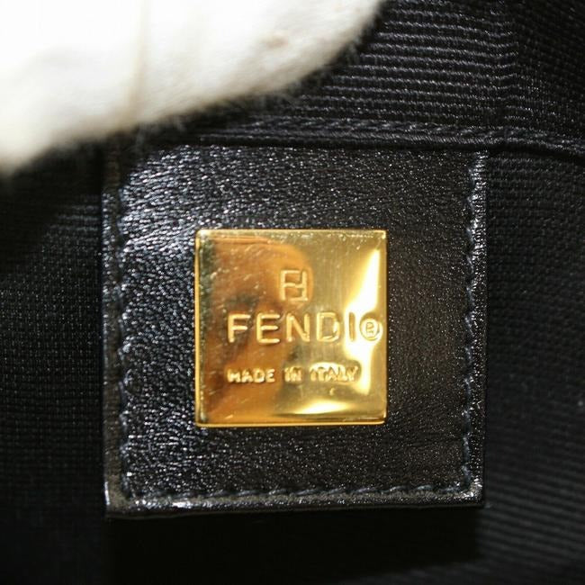 Inside, it has one large compartment with a leather Fendi tag with the serial #2306 26423 089 embossed on the back. There is not a lining and the interior is very clean. The purse is made in one of the Fendi signature lines- the Fendi 1925 logo design in dark brown and black with gold tone accents. All hardware is signed as Fendi.