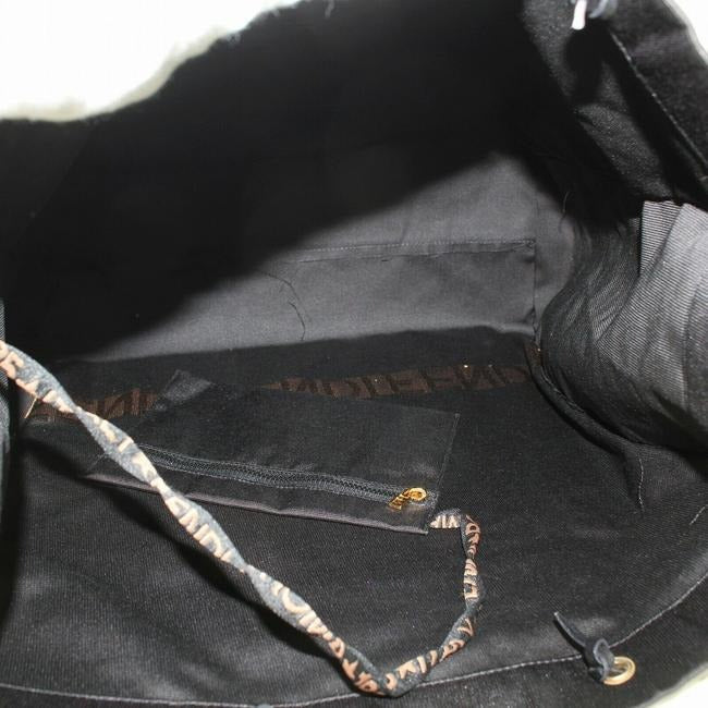 The bag is an unique take on a classic tote style purse by Fendi! It an XL size made of black canvas with the brown 'FENDI' logo print around the bottom with two drawstring type handles. There is a zip close wallet that is about a fifth of the size of the bag itself and attached with a ribbon with the 'Fendi 1925 Roma' logo print throughout.