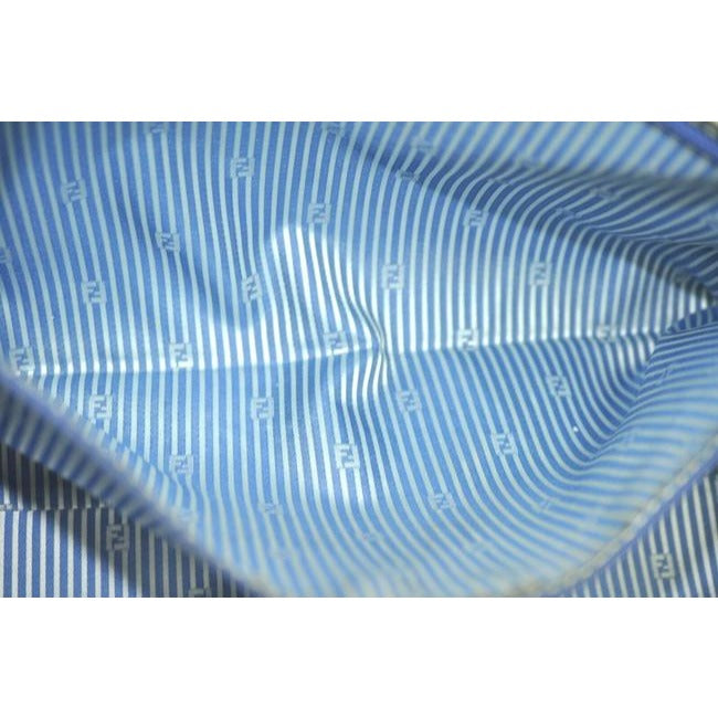 The Roll style tote bag has become an iconic purse style by Fendi; This is a roll style tote in a limited edition, must-have color combination and print! It is an XL size with two longer handles, in a satchel or tote style and a graduated shape! The tote is a handheld or shoulder bag made with Zucca print heavy coated canvas material in white with blue contrast stitching that matches the white and blue lining on the interior. It has a top, zip style closure and gold accents and hardware.