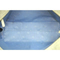 The interior is in excellent condition with a matching white with blue fabric lining. The lining has a logo print throughout and is made of a silky, very clean fabric. The use of space in and shape of this purse allows it to hold a lot more than you'd think! There is a zip pocket on the interior. This would be the perfect size to use as an everyday purse or for a tablet or laptop bag!