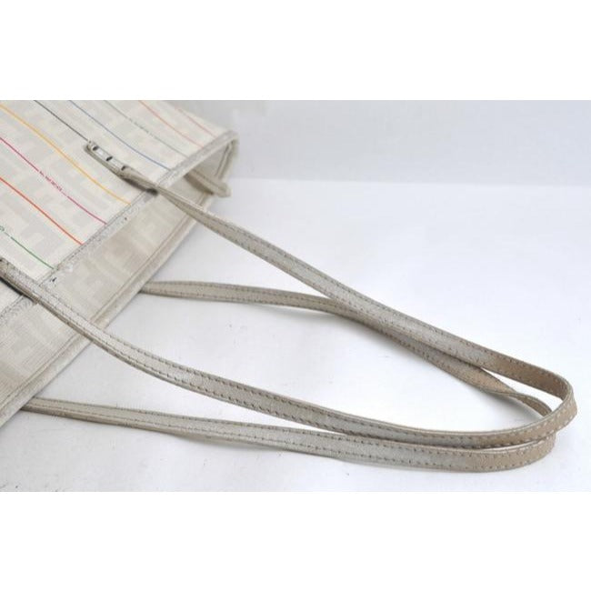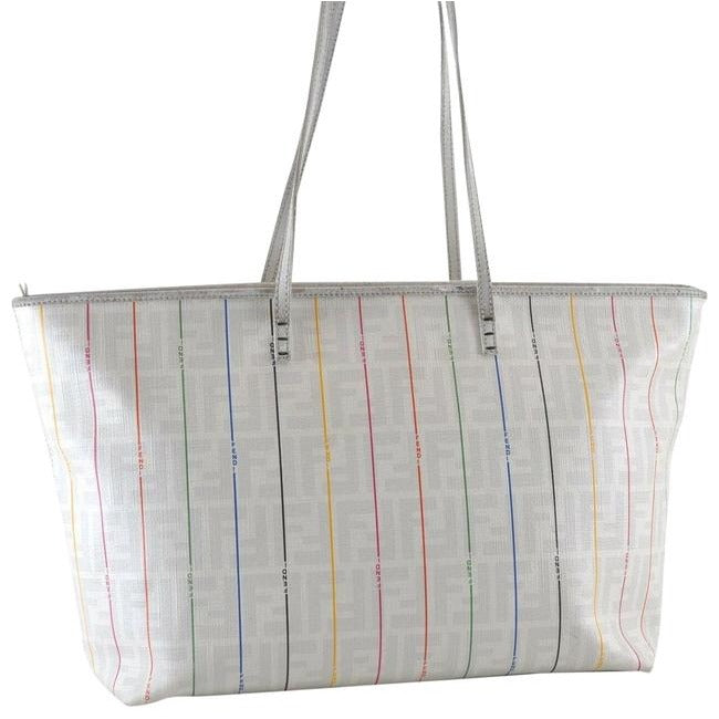 For sale is an AMAZING, Fendi, white Zucca print canvas and leather top handle, XL 'Roll' tote style, handheld or shoulder bag with multi-color stripes with 'FENDI' in them, two handles, a gold FF logo and leather zipper fob, blue/white striped logo print lining, and a tapered shape that allows it to hold quite a bit! This piece from Fendi is an everyday piece that is timeless!