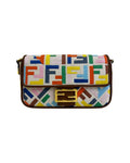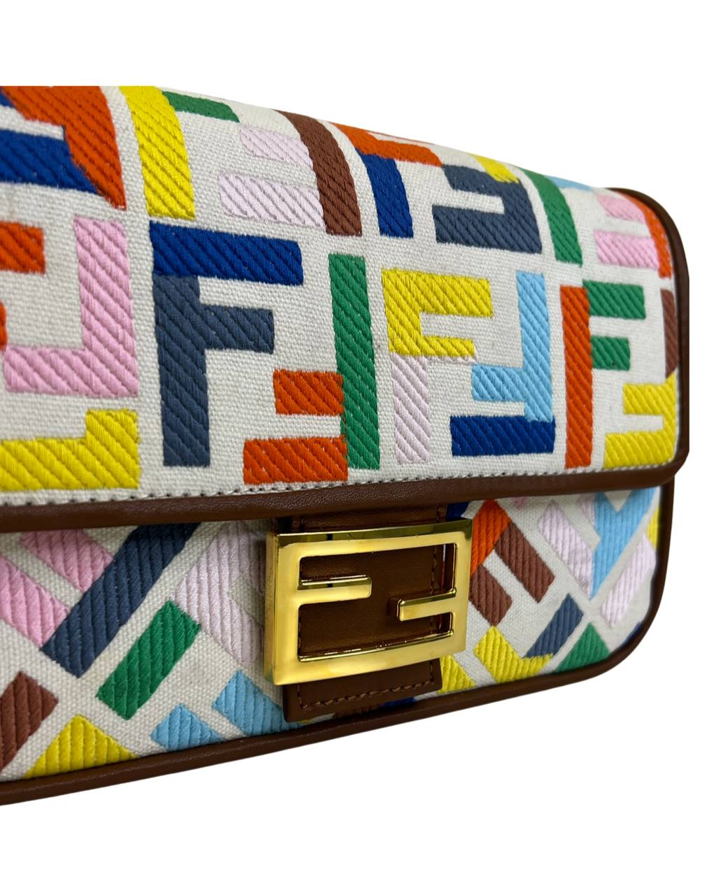 Iconic medium Baguette bag made of beige canvas with a multicolor raised embroidery FF motif, trimmed in tone on tone leather.