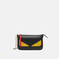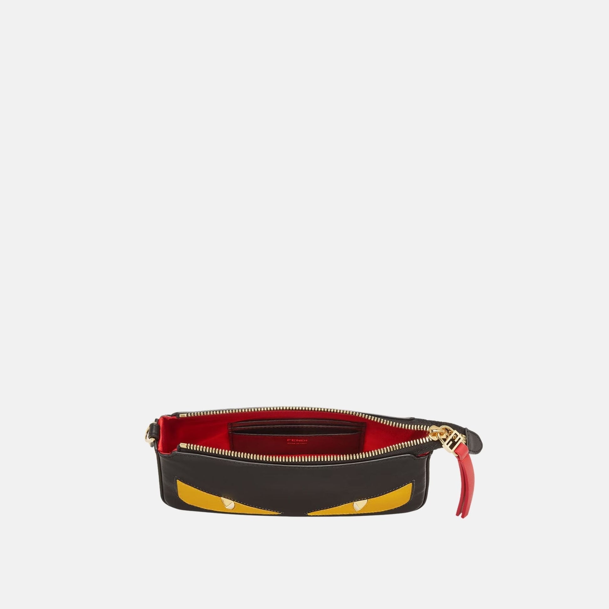 The Fendi Baguette Pouch In Leather is a bold and stylish accessory, blending luxury craftsmanship with a playful design. Crafted from soft black calfskin, this pouch is inlaid with yellow leather Fendi Eyes, giving it a distinctive and modern character. The three-dimensional metal irises add an extra touch of uniqueness, making this bag a statement piece for any collection. Designed for functionality and elegance, it features a zip closure with a striking red leather zip-pull, adding a pop of color to its sleek silhouette.