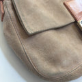 The suede material and its delicate color show some signs of the previous use: on the corners and sides there are some stains and color transfer, which might be ca by the rubbing of the bag on some darker fabric