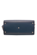 The top zipper opens to a matching blue leather interior with a hanging dual patch pocket.