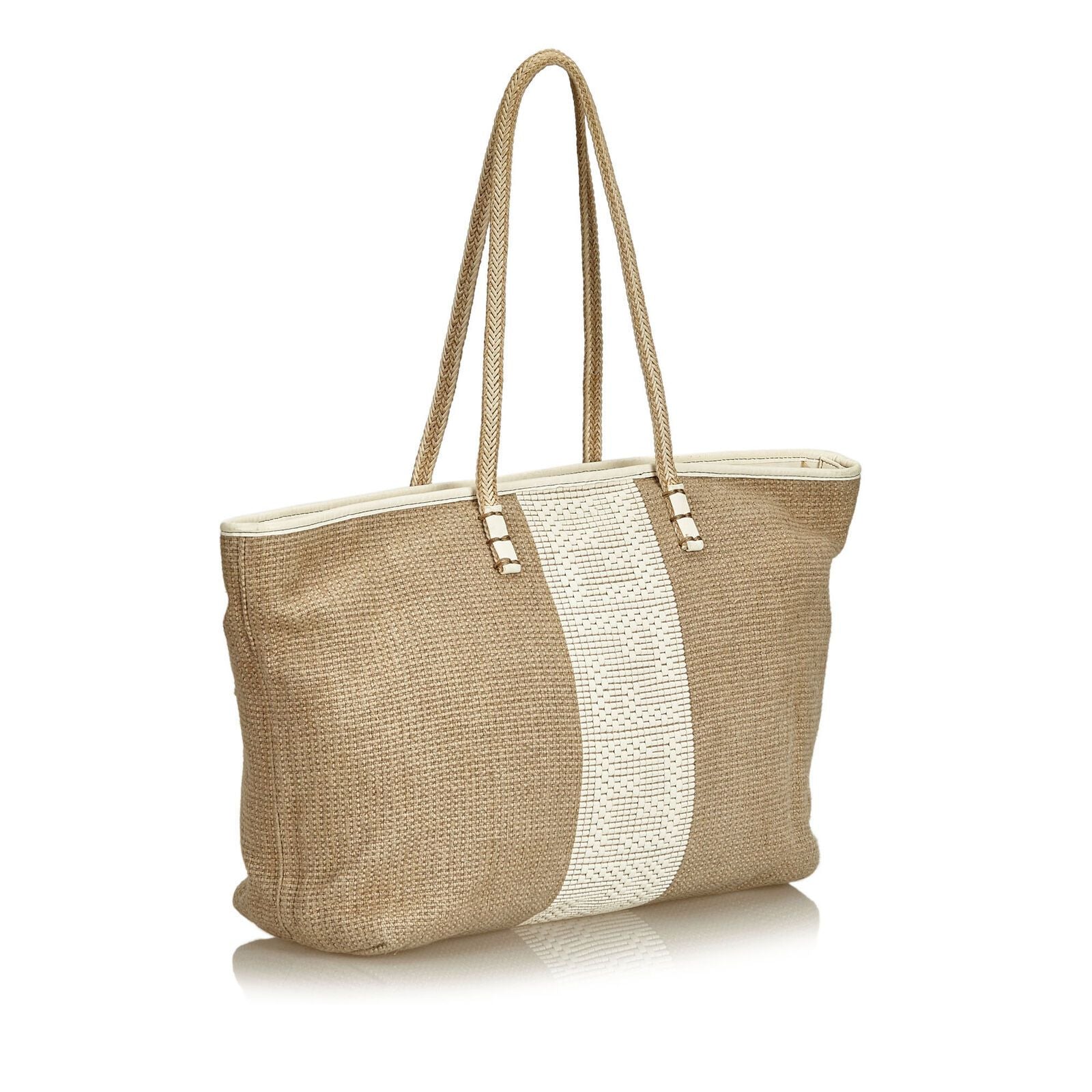 Fendi Brown Beige Hemp Natural Material Striped Tote Italy