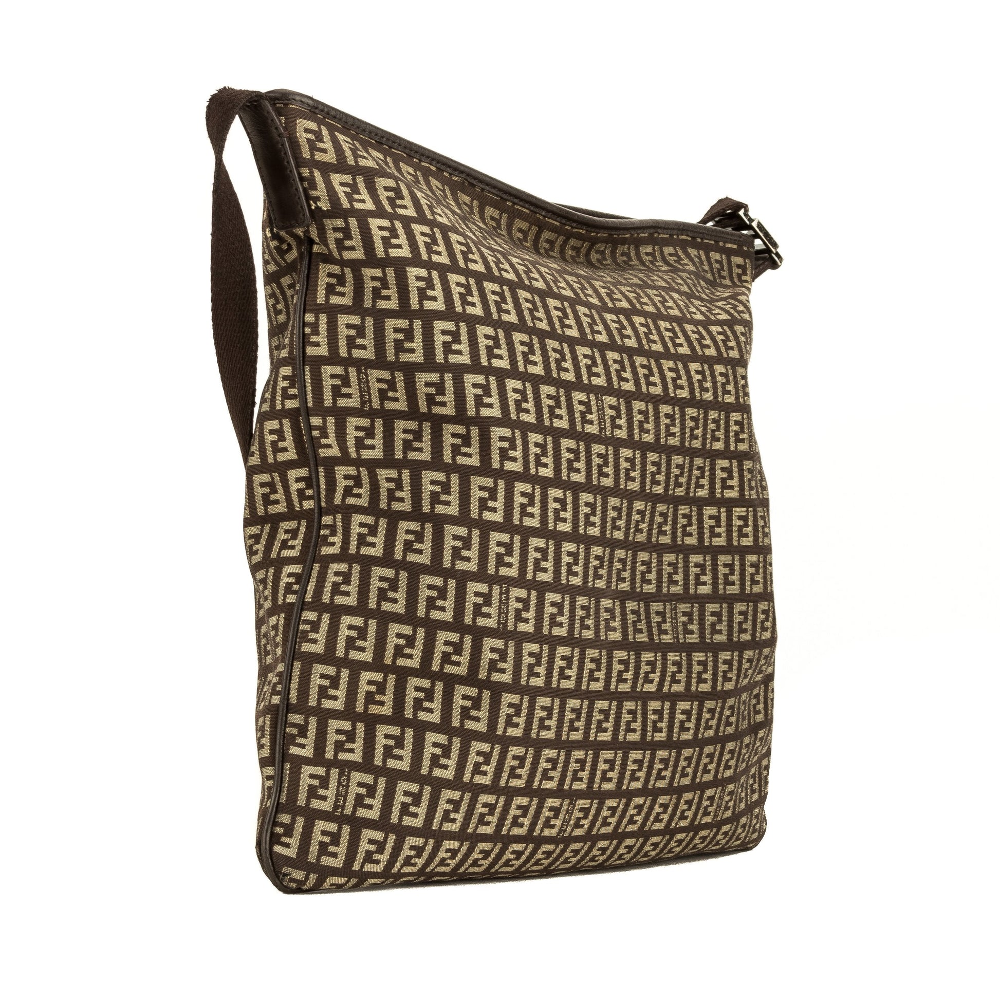 This is an , FENDI Zucchino ShoulderBag. This is a vintage, Fendi bag for any occasion. It has a unique crossbody style - featured in the Fendi Zucchino canvas with a dark brown leather trim, an adjustable shoulder strap, a side flap pocket, and ruthenium-tone hardware. The interior has a textile lining with space for your necessities and a zip closure. Made in Italy.