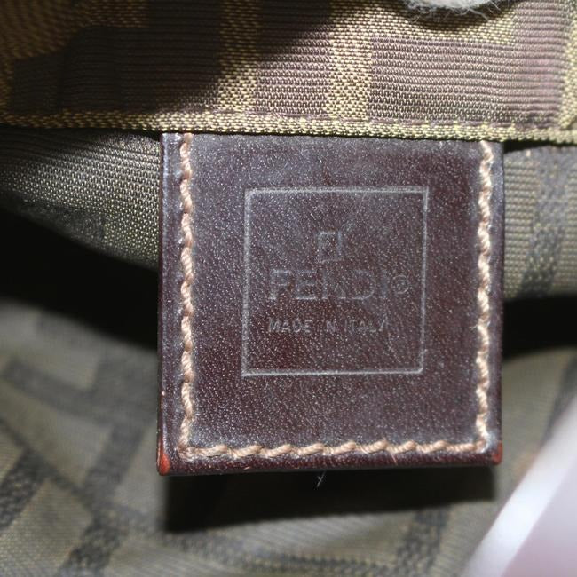 The purse is made in one of the Fendi signature patterns-the large F logo or 'Zucca' design. It is comprised the F logo design in 'tobacco' colors or dark brown and black patterned canvas and brown leather and chrome accents. All hardware is signed as Fendi and it has a leather bottom. There is an embossed leather tag that reads 'Fendi, Made in Italy' with the serial # '2220 26598 099' embossed on the back. It was authenticated by a third party expert, so buy with confidence!