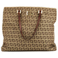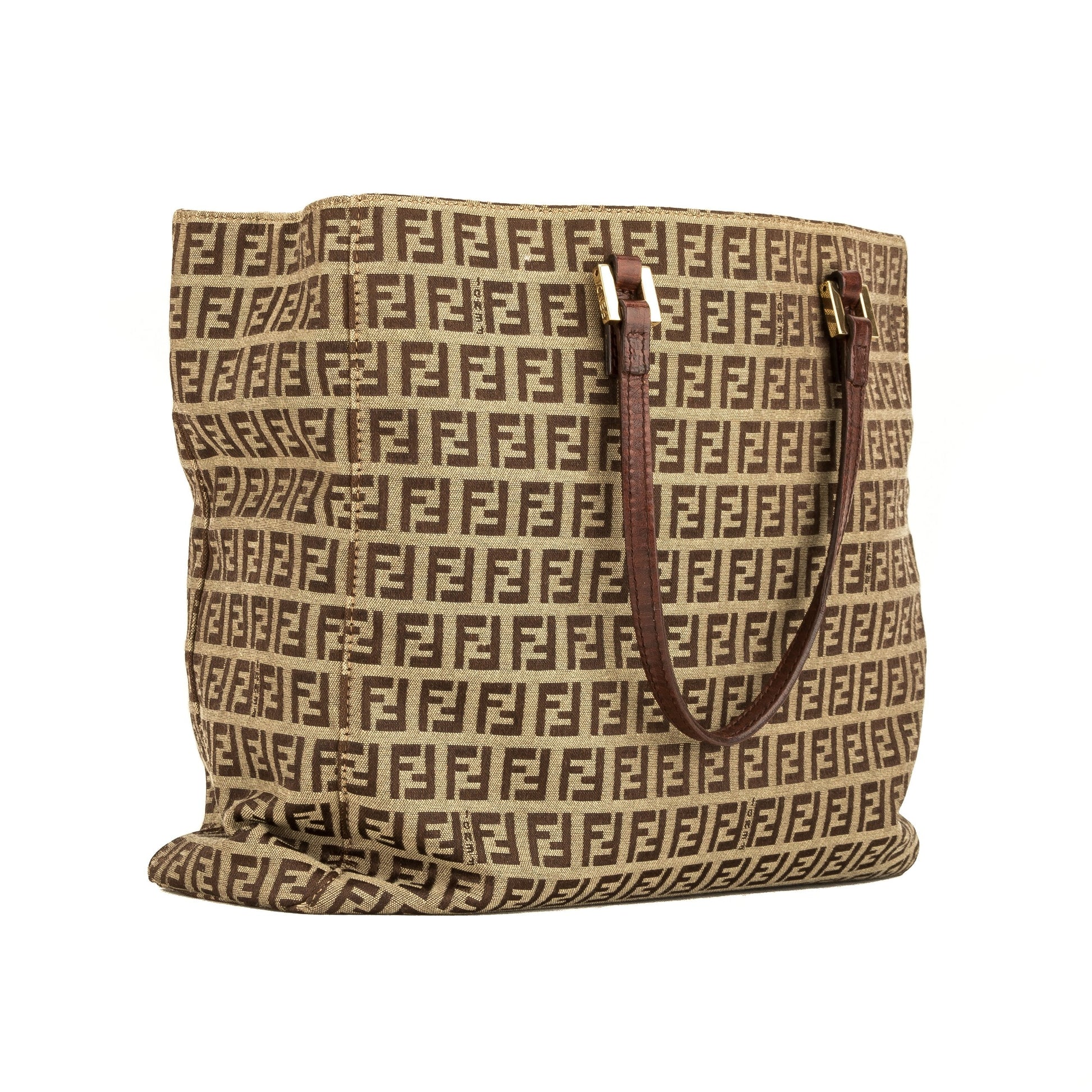 This , Fendi Zucca Tote features the classic FF mono exterior with dark brown leather trimmings and an open closure.Gold tone hardware over brown canvas.