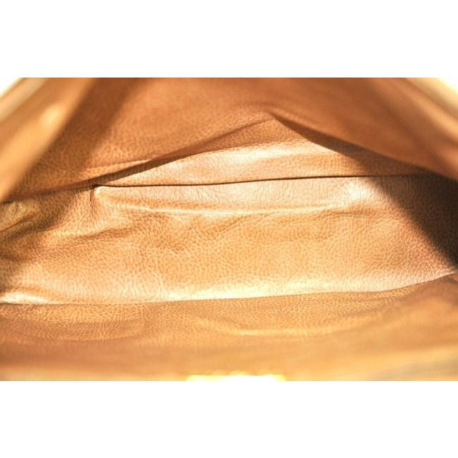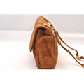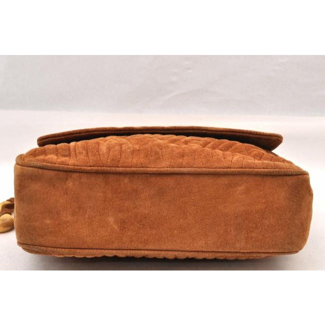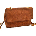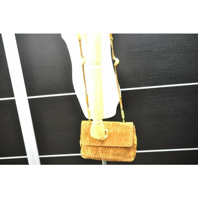 This early bag is by Fendi is amazing! It is an envelope top, two way style made a caramel brown quilted suede in a 'pasta' or 'noodle' design and gold beads that look like types of pasta attached throughout the removable shoulder strap. It is a roomy two-way style that can be worn as a shoulder or cross body style or the strap, which is attached with toggles can easily be removed. This early quilted suede/leather or 'pasta/noodle' line by Fendi has been re-released with quilted logo designs and designs that are more geometric and linear in the leather and suede.