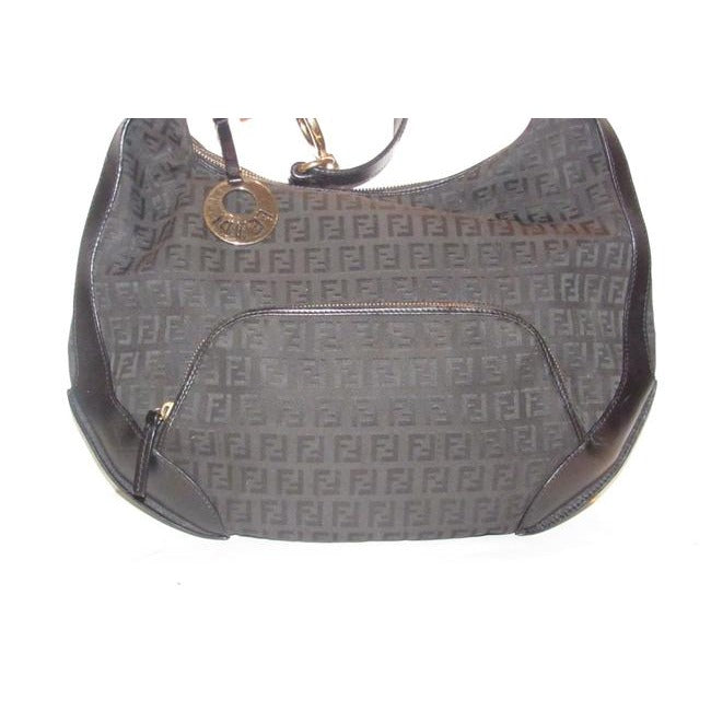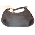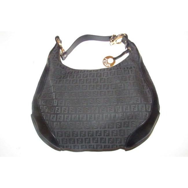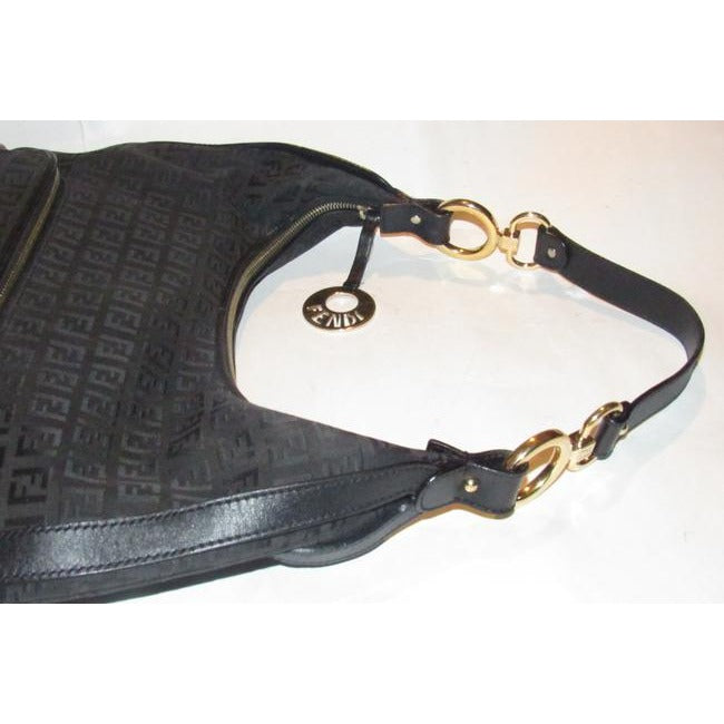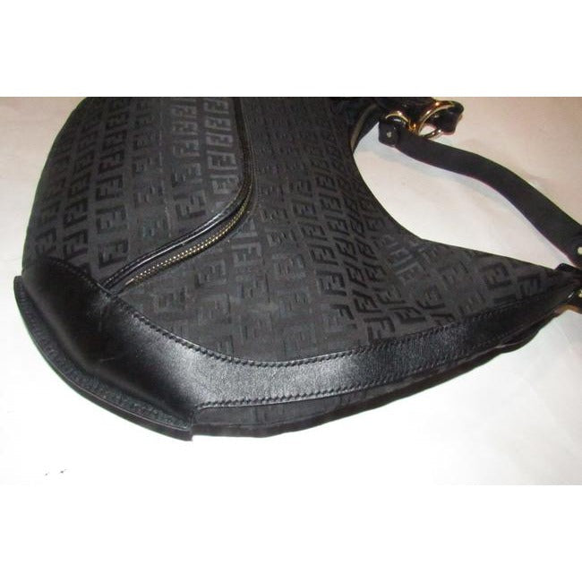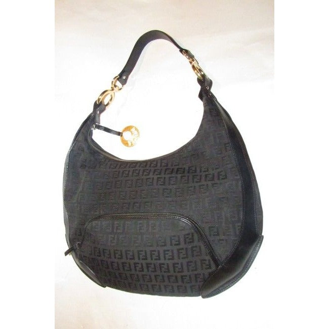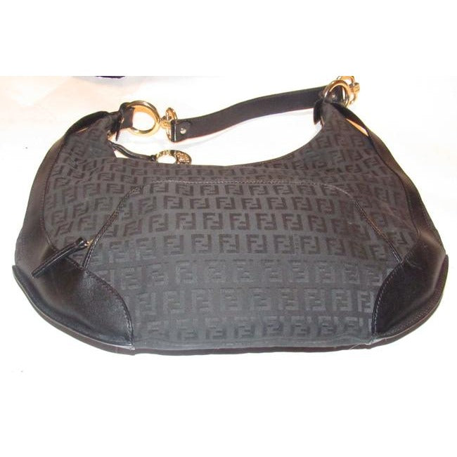 Fendi Chef Shoulder Purse Black Zucchino Or Small F Logo Print Canvas And Black Leather Hobo Bag