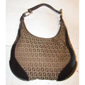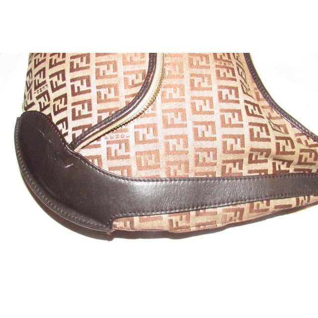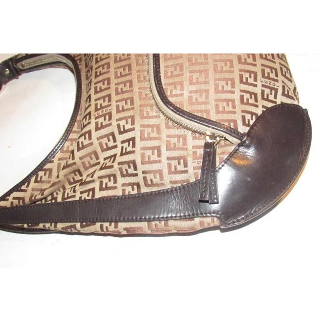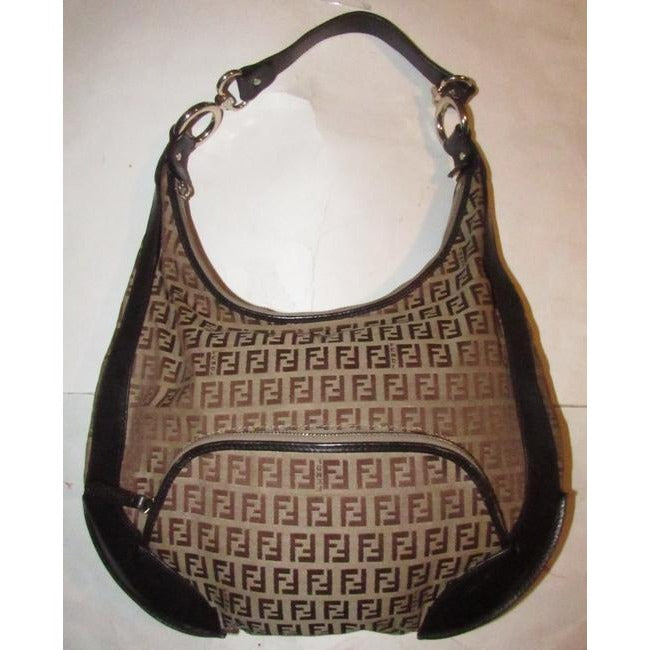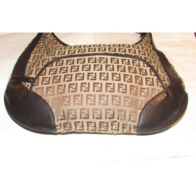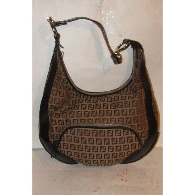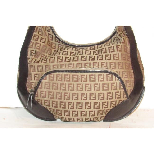 The bag is a rare, 'Chef', XL hobo style shoulder purse by Fendi. The purse is made of brown Zucchino or small F logo print light brown on canvas and brown leather! It has a lot of room, with a zip top closure and a large zip close pocket on the front exterior. It has large gold tone circular pieces that attach the strap that are engraved 'Fendi'.