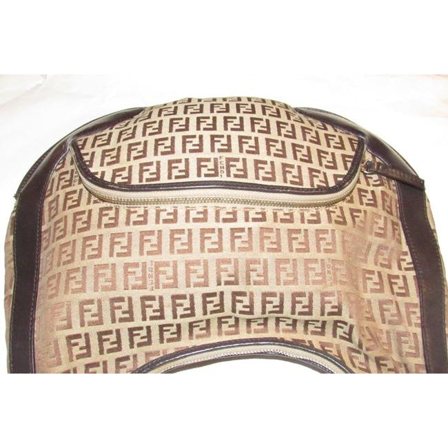 For sale is a Fendi, 'Chef', RARE, brown Zucchino or small F logo print light brown on canvas and brown leather, XL hobo style shoulder bag with a front zip close pocket, a top zip closure with bold gold accents and engraved 'Fendi' logo hardware throughout! This purse will look great with everything!