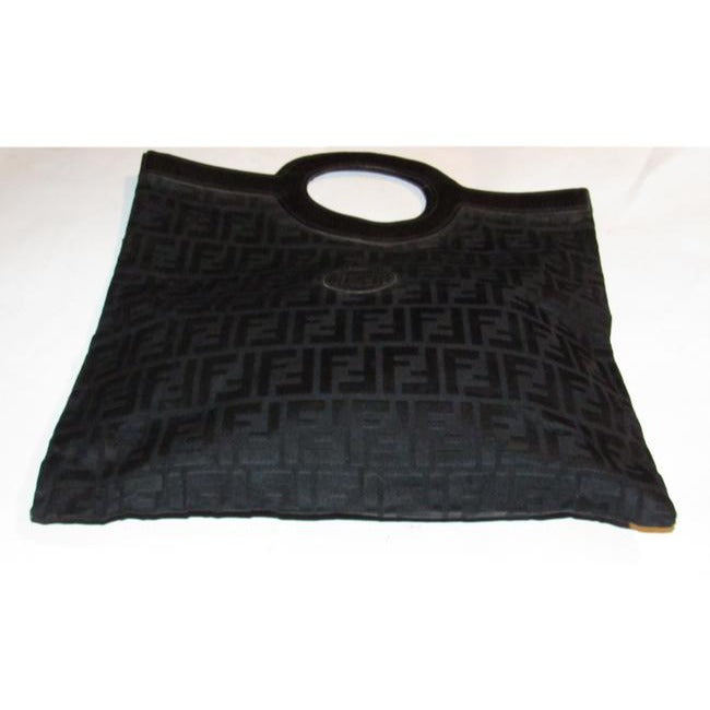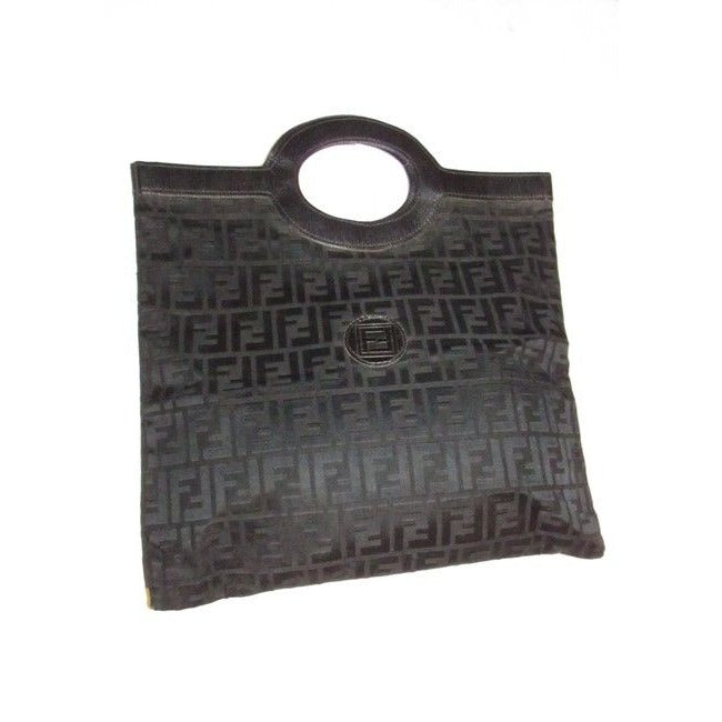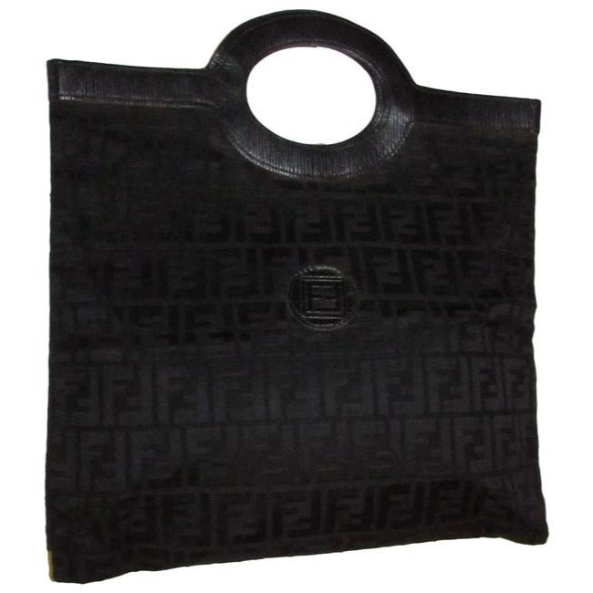 For sale is a vintage, Fendi, RARE, black Zucca print canvas and textured black leather XL top handle, runaway or porthole style tote or fold-able clutch with two leather oval accent porthole handles at the center and an open top! It is a unique, early bag from Fendi that is very similar to the styles currently being offered by the Italian design house!