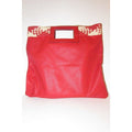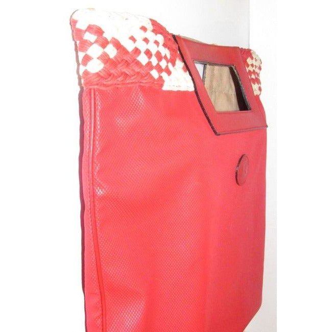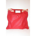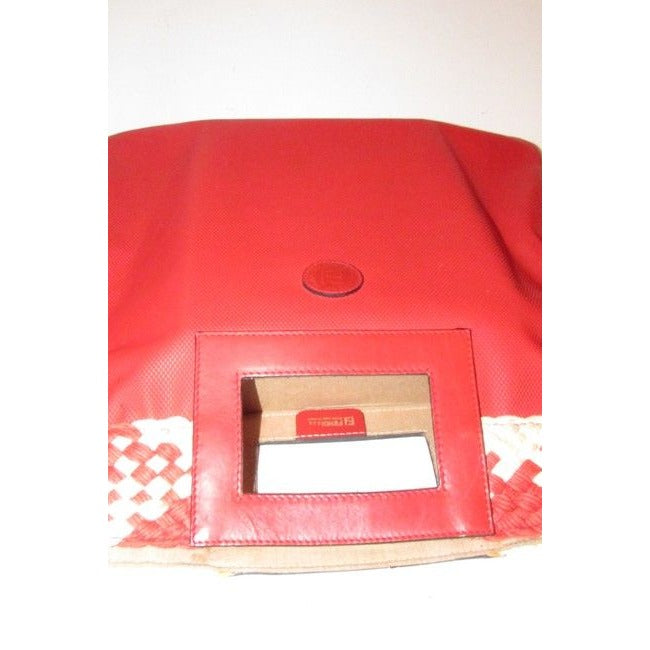 The rectangular tote or clutch is very similar to the pieces Fendi recently released for 2021-22 with its use of multiple materials and simplicity of design! It is made from red saffiano leather (or maybe? faux leather with a saffiano texture). It has an open top that has two, smooth red leather rectangle cutouts as the handles with a 3" strip of ivory and red fabric or jute woven or braided along the top edge. It does not have any metal hardware, but there is a round leather patch on the front embossed with 'FF, Fendi, Roma, Italy, 1925' on the front!