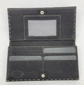 Front snap closure opens via double fold to a brown leather interior with clear frosted id pocket, 2 larger slit cash pockets and 6 credit card slots.