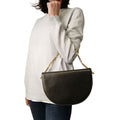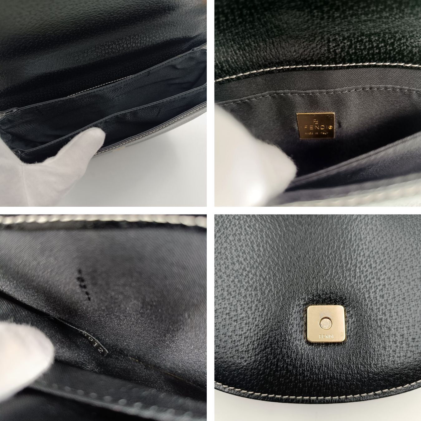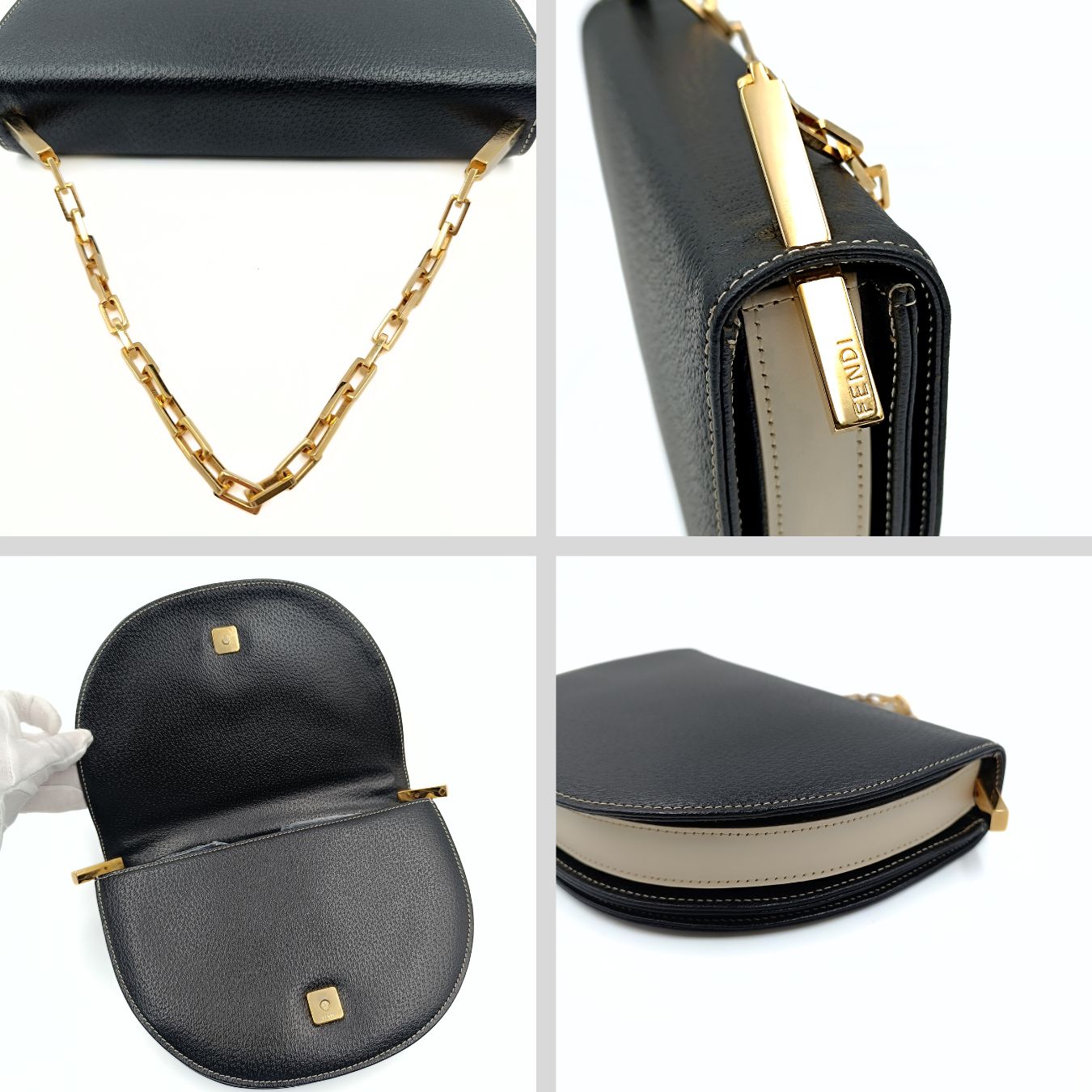 Fendi two-tone leather handbag with chain.Half moon model, with white leather profiles and golden chain.Snap button closure.Interior with three compartments with a small zippered pocket.It has been a few times and is in excellent condition.It does not come with the original dustbag.DIMENSIONS: L: 25 cm - H: 17 cm - W: 5 cm - Handle 17 cmAll our items are selected, carefully sanitized and ated by our experts.CODE: 5531B326BRAND: FendiMADE IN: ItalyITY CODE: 3165840012Black colourMATERIAL: LeatherCONDITION: Excellent