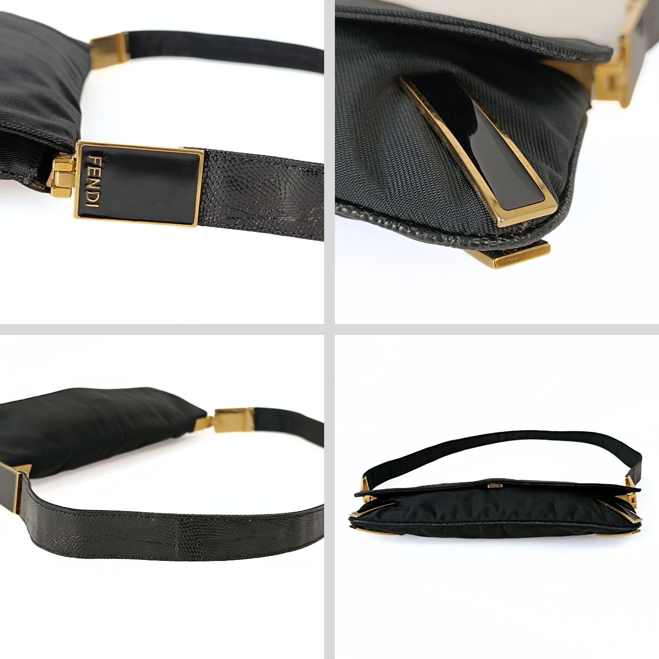 Fendi vintage baguette in nylon and snakeskin.Decorated with enamel and gold metal inserts, both on the handles and at the corners.Snakeskin shoulder pad.Snap button closure and one internal zip pocket.It has small scratches on the metal inserts but the general conditions are excellent.DIMENSIONS: L: 33 cm - H: 13 cm - W: 3 cm - Handle 35 cm.All our items are selected, carefully sanitized and ated by our experts.CODE: 5551B157BRAND: FendiMADE IN: ItalyBlack colourMATERIAL: NylonCONDITION: Excellent