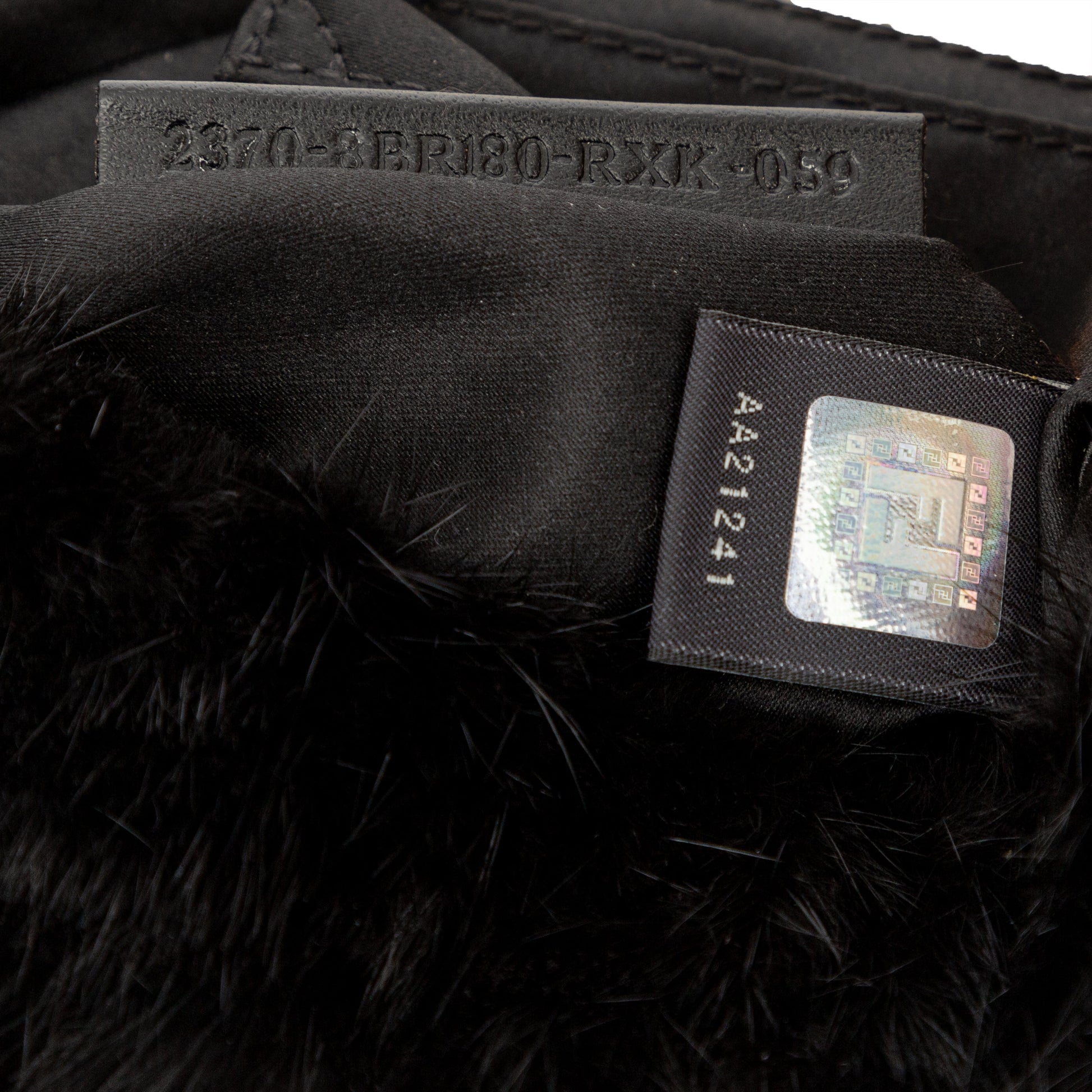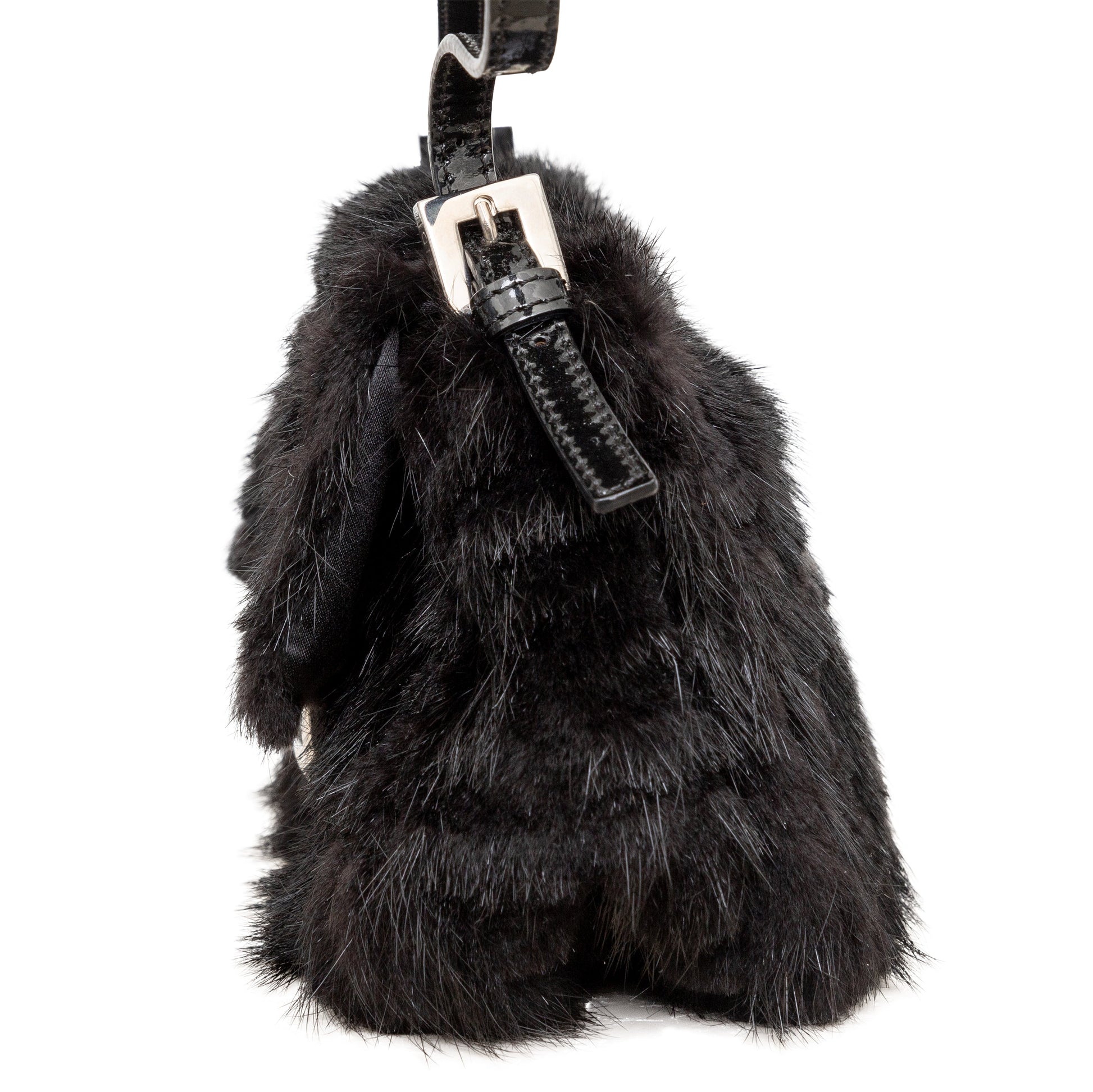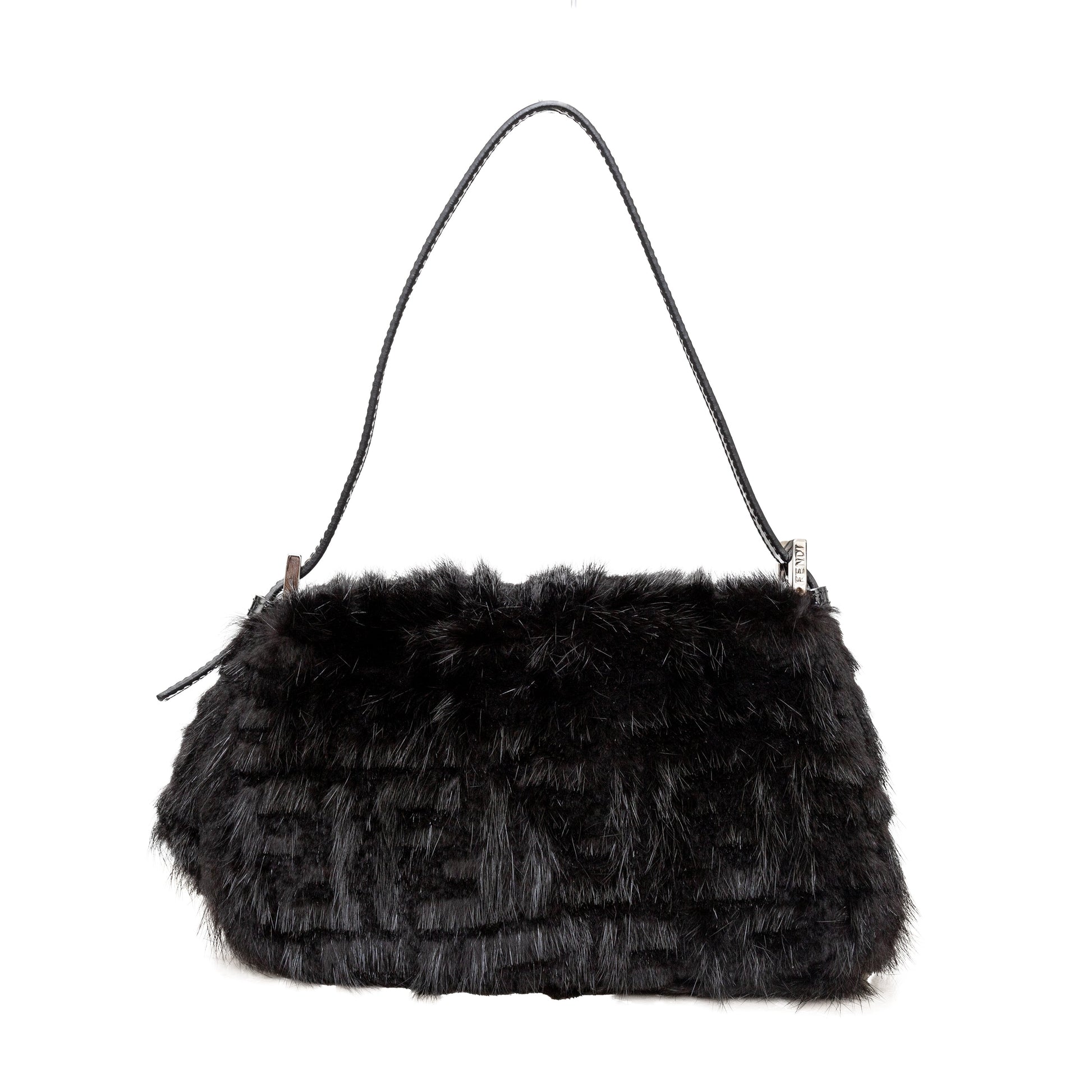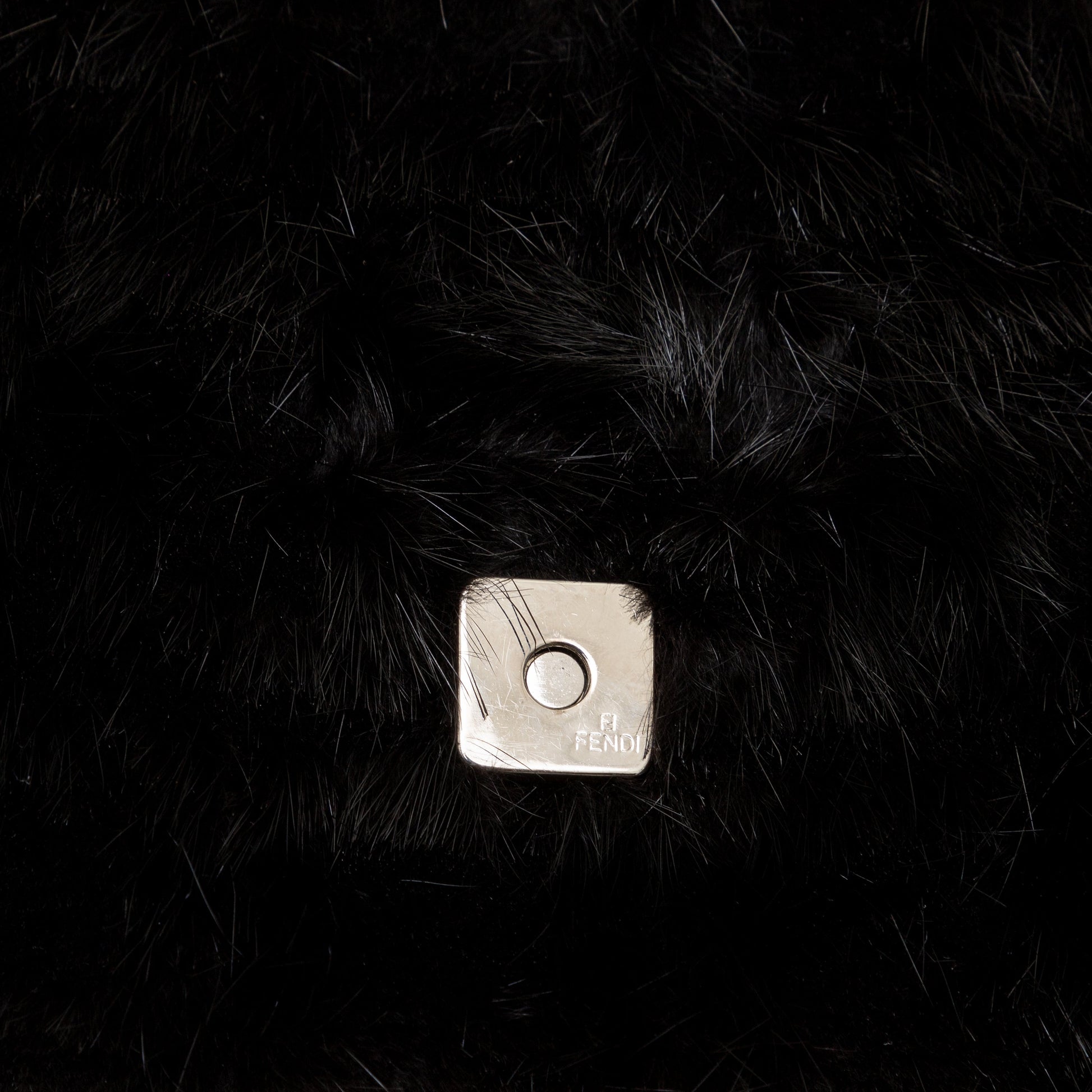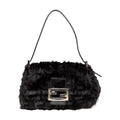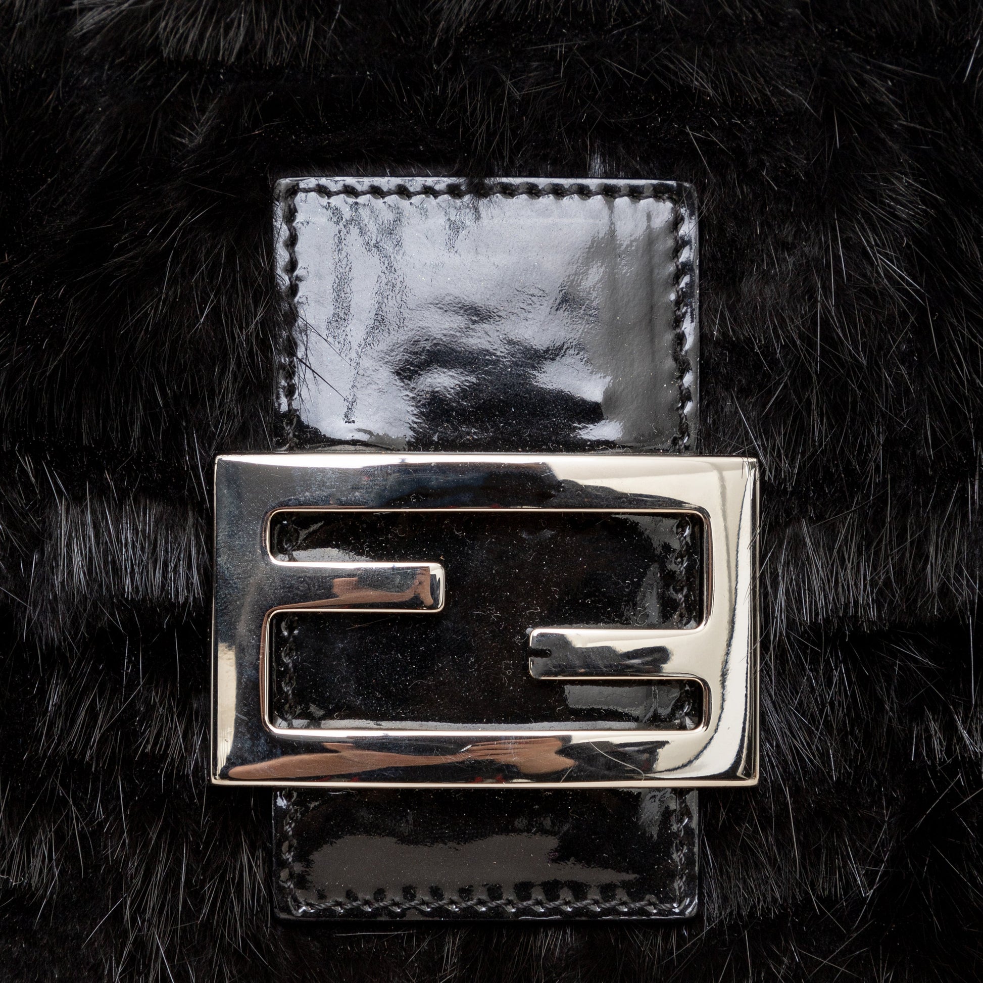 Crafted with black fur featuring the iconic FF monogram pattern, this baguette bag boasts a looping shoulder strap that is adjustable with a buckle and a sleek front flap with a magnetic FF buckle in silver tone hardware.