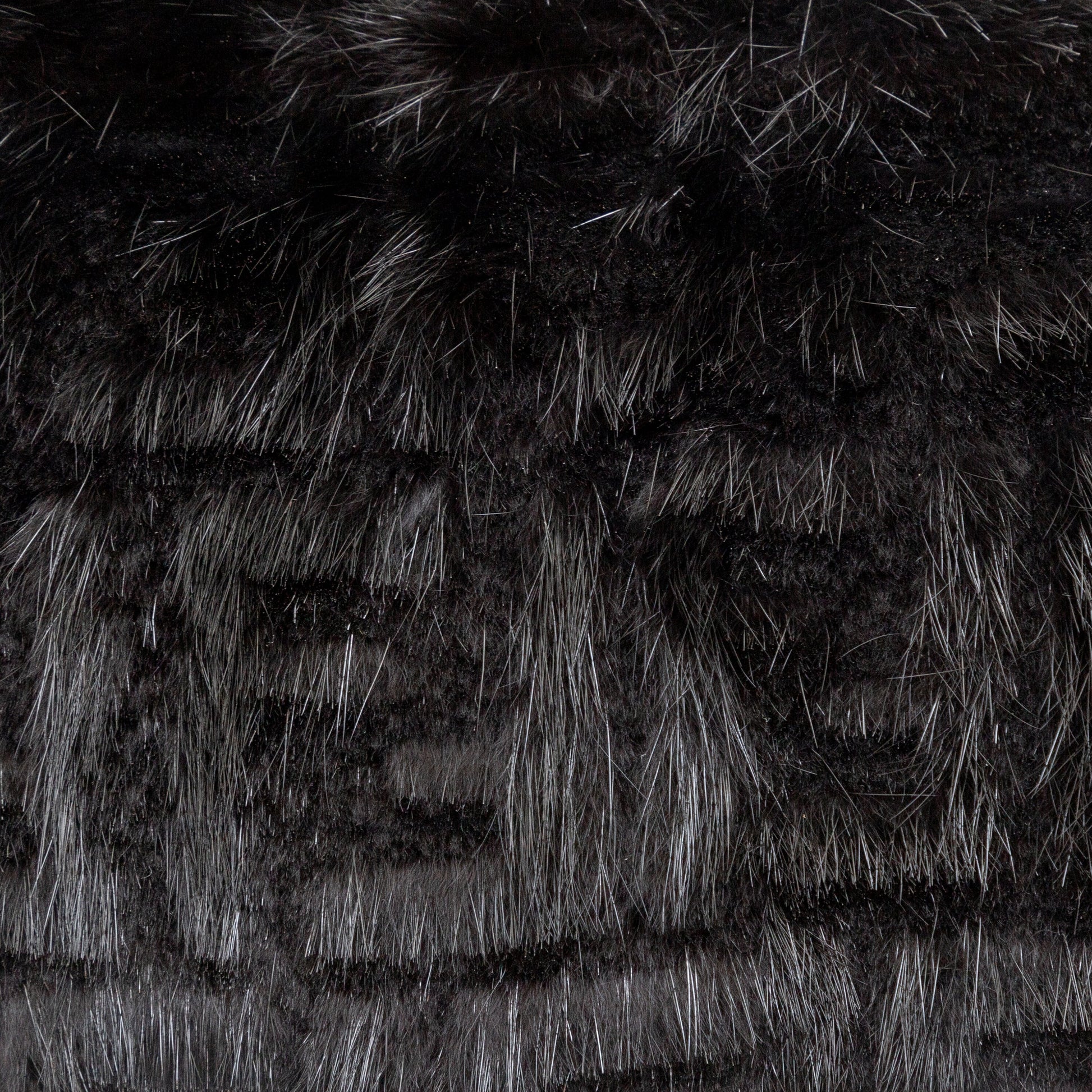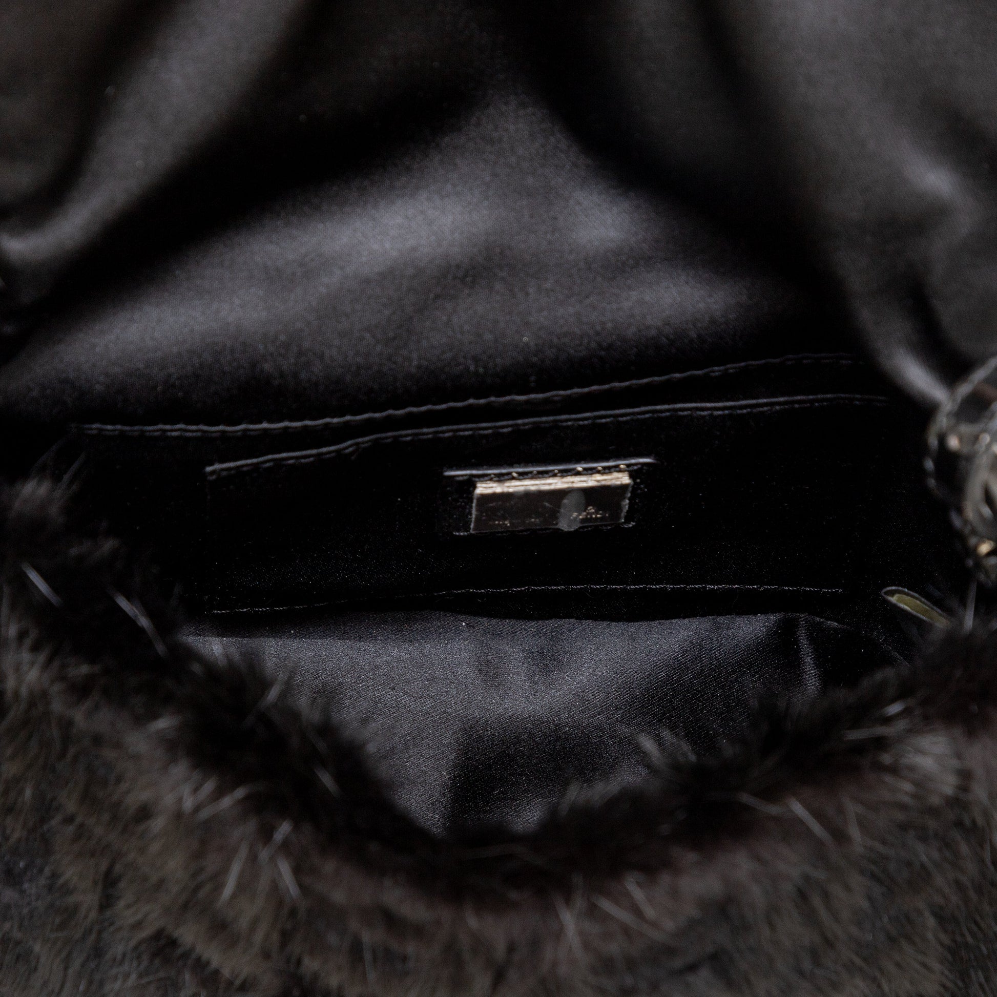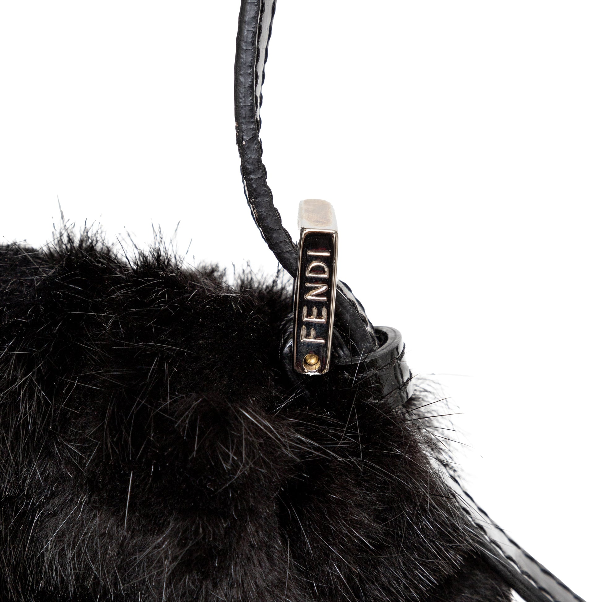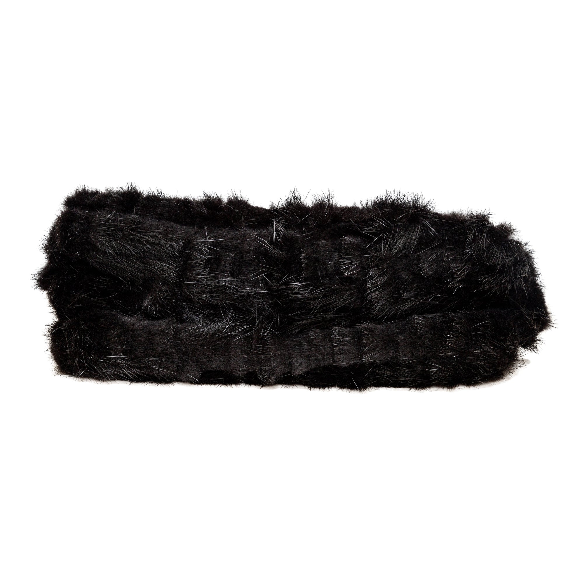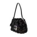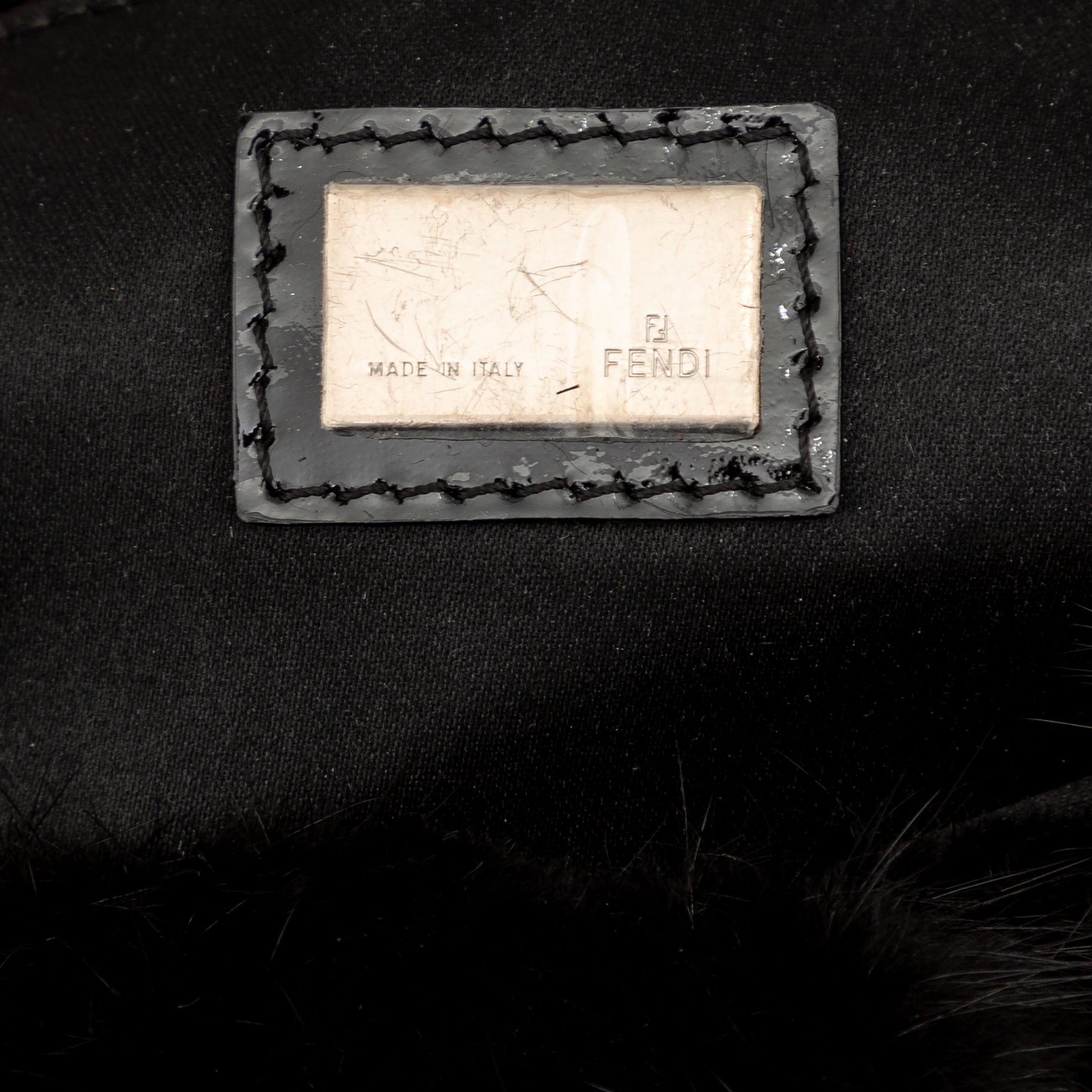 Crafted with black fur featuring the iconic FF monogram pattern, this baguette bag boasts a looping shoulder strap that is adjustable with a buckle and a sleek front flap with a magnetic FF buckle in silver tone hardware.