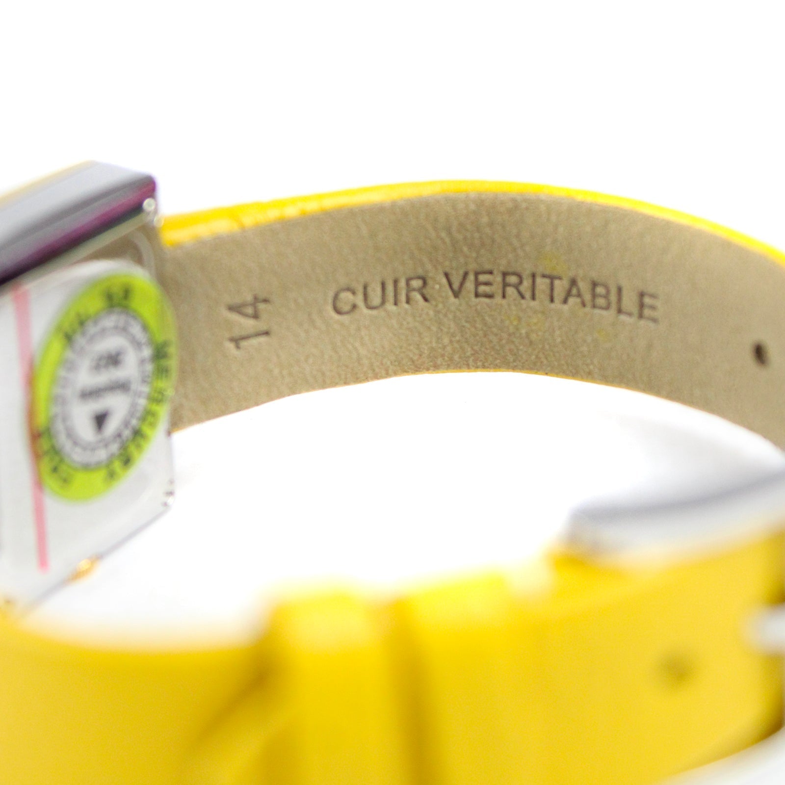 Size 38mm Steel case Wrist size: 19.5cm Dial dimensions: 2.5cm x 2.1cm Yellow leather bracelet Composition: stainless steel No brand STATE Packaging Never Box