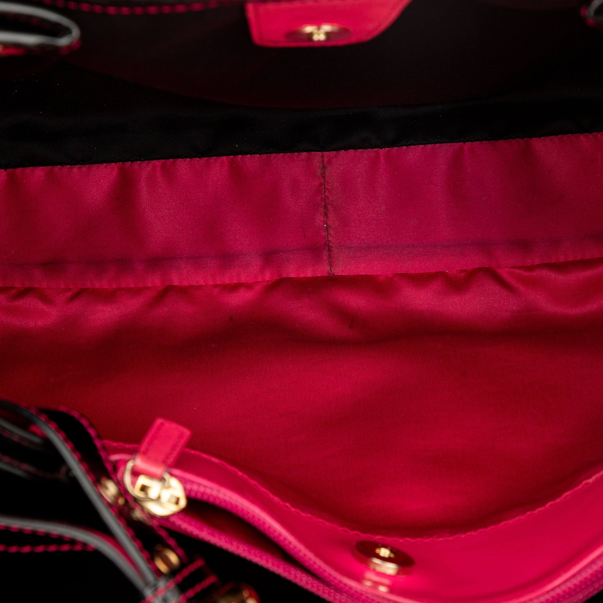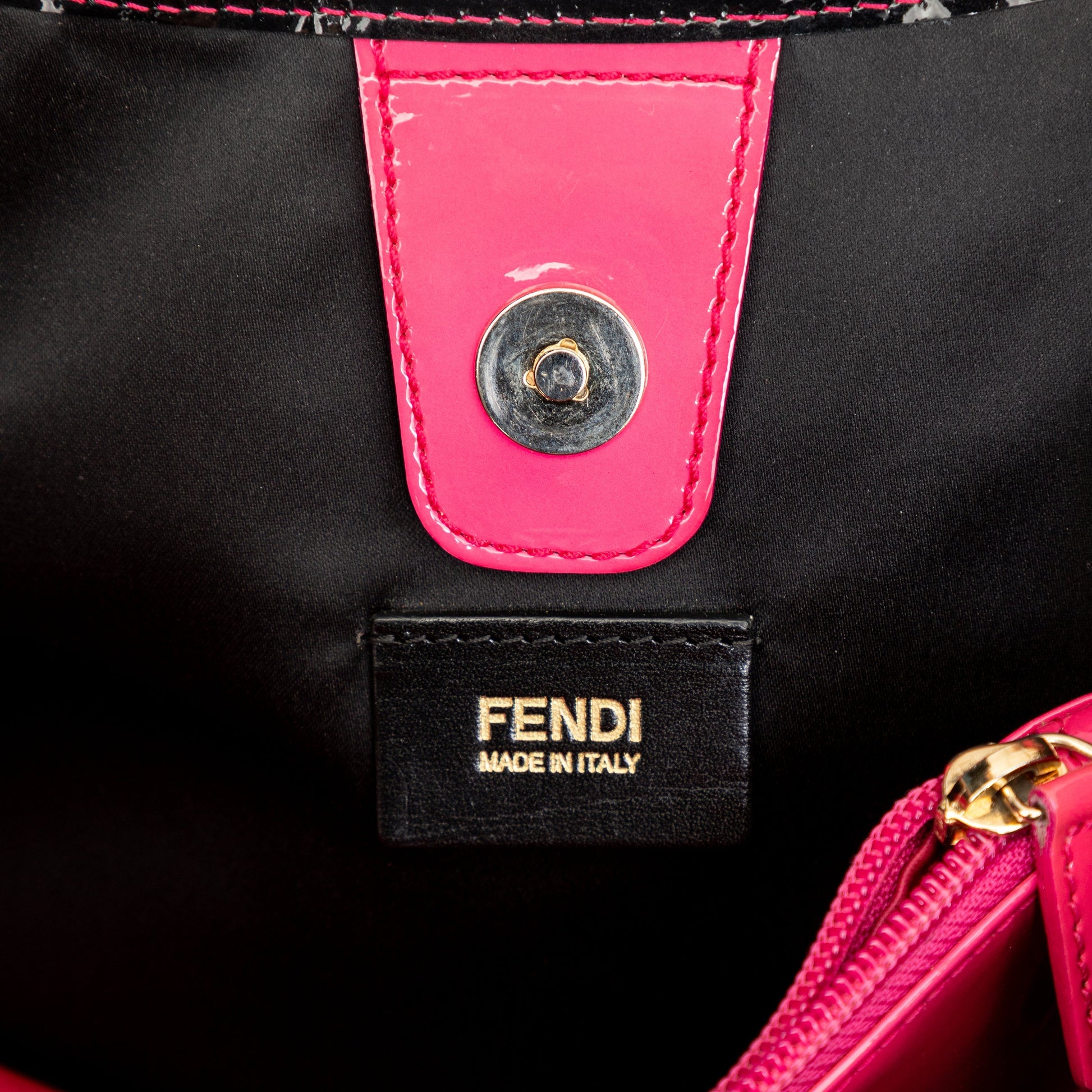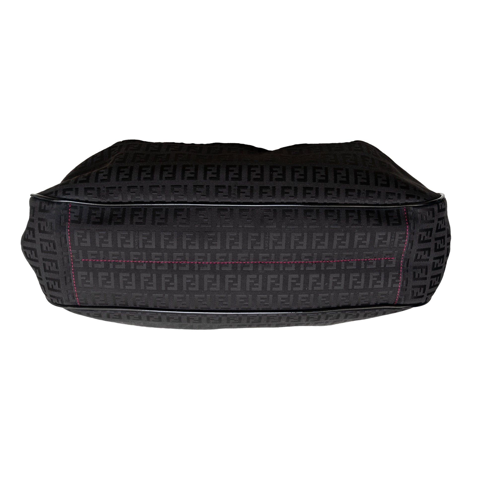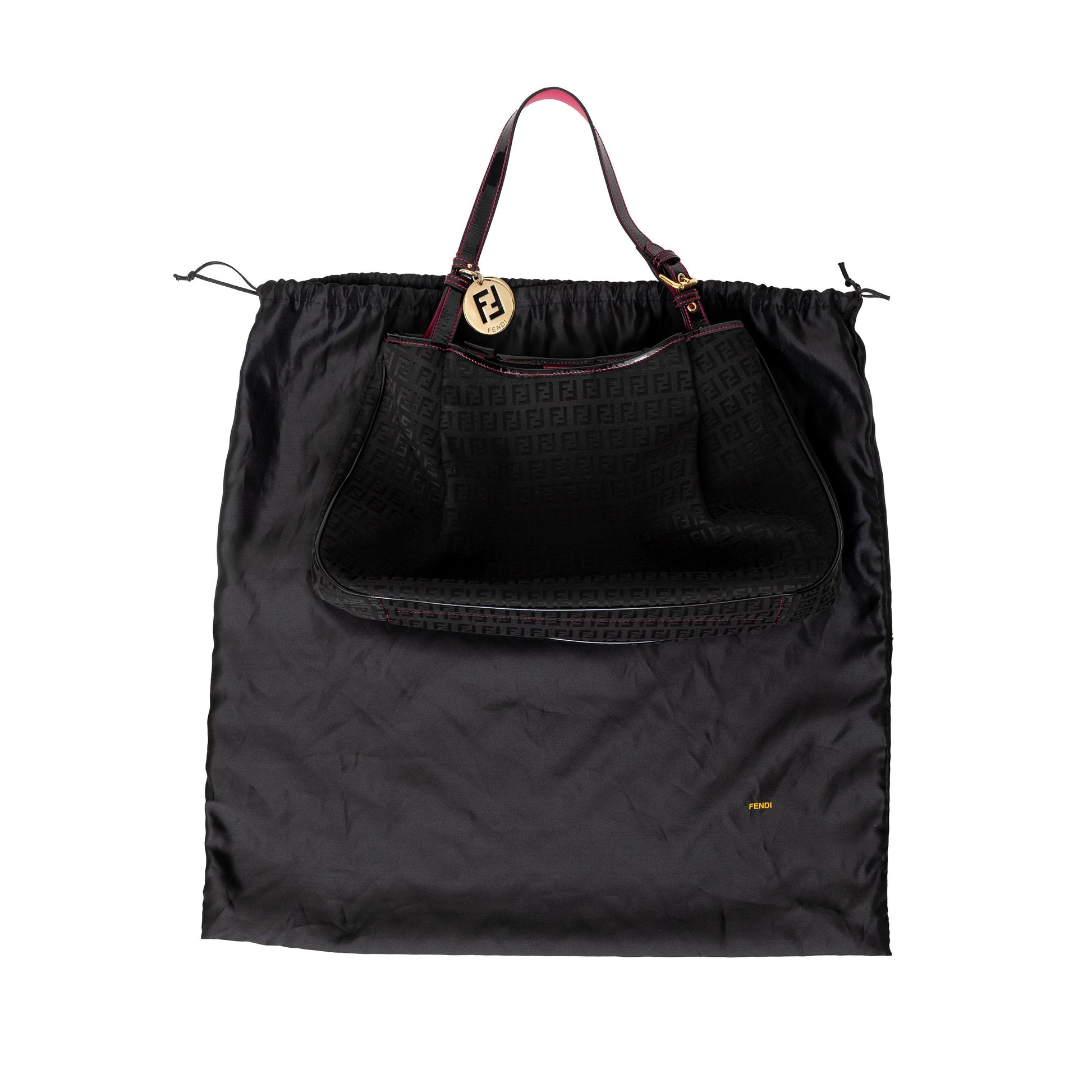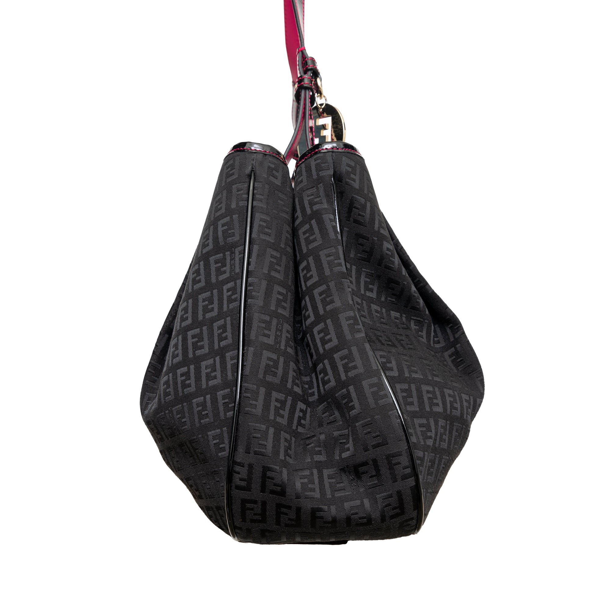 Made with black Zucchino monogram printed canvas and shiny black leather with pink trim, it also includes a Fendi charm in gold tone.