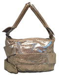 Strips of gold leather cover exterior over gold leather body with front side zippered exterior pocket, matte silver hardware and unique hinged handle.