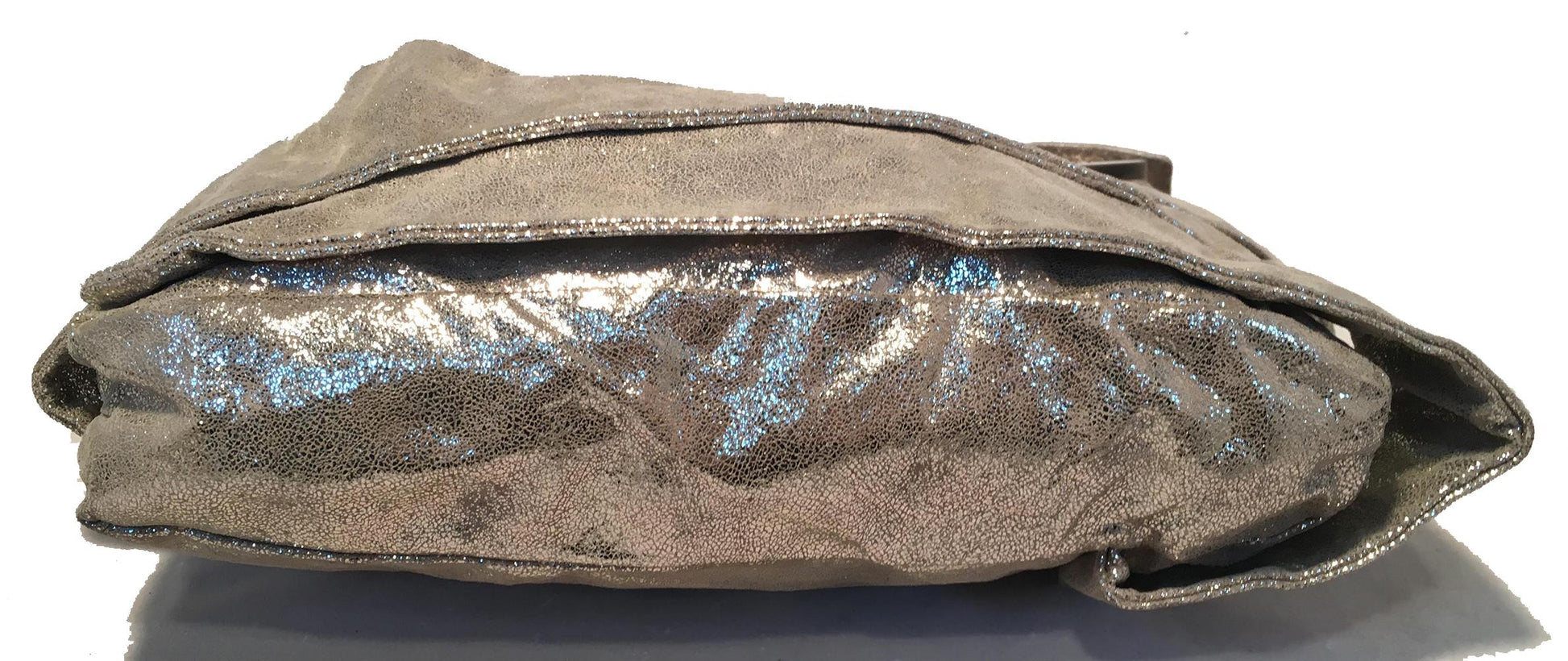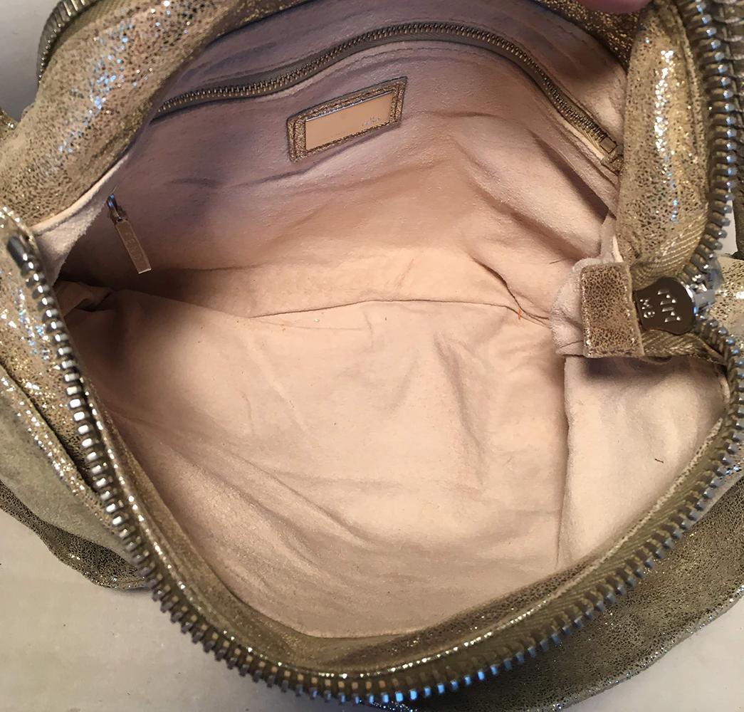 Top zipper closure opens to a beige suede interior that holds one side zipped pocket.