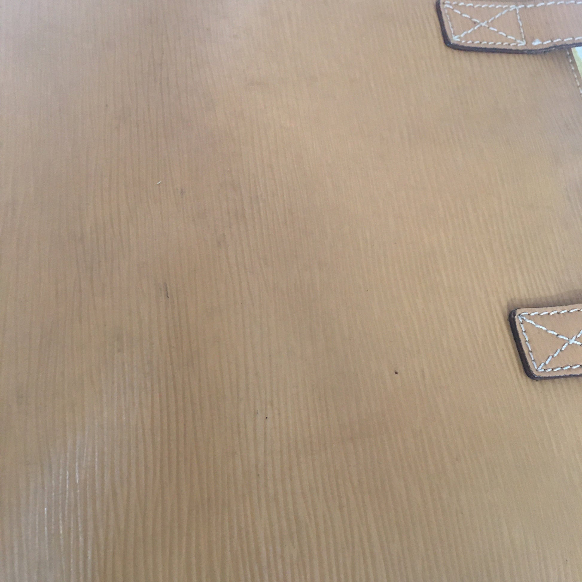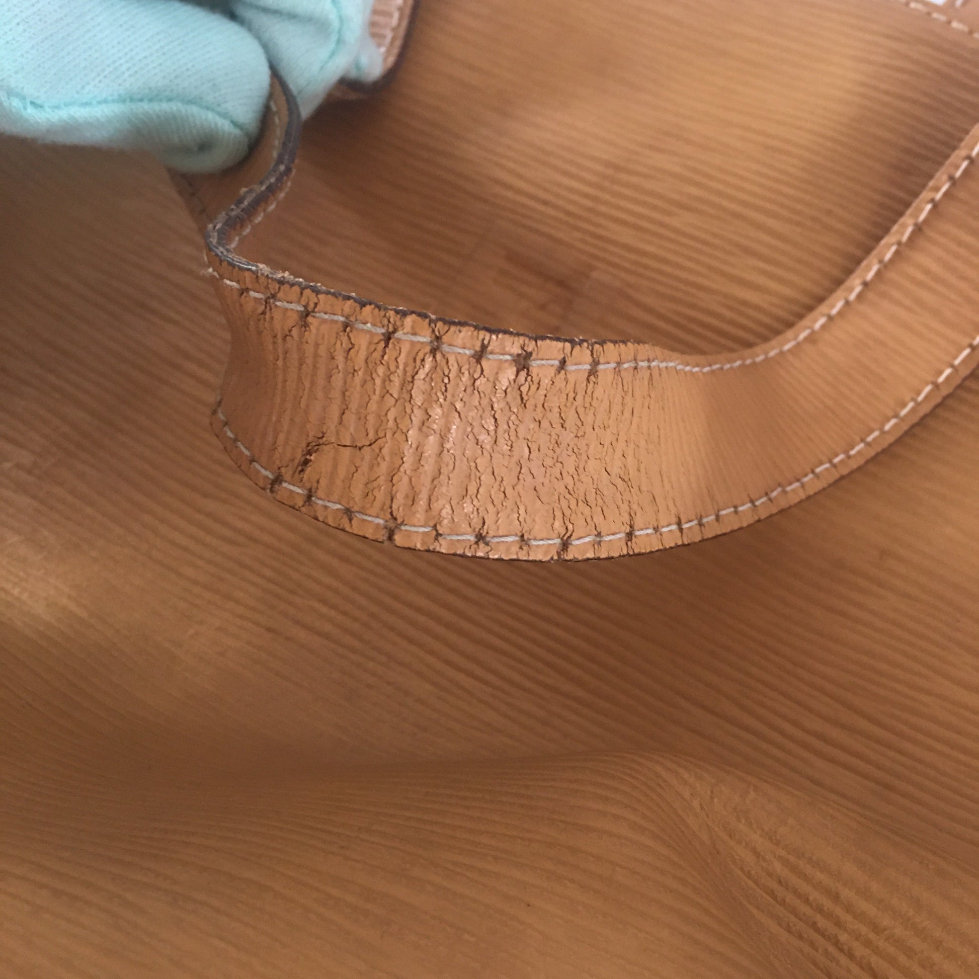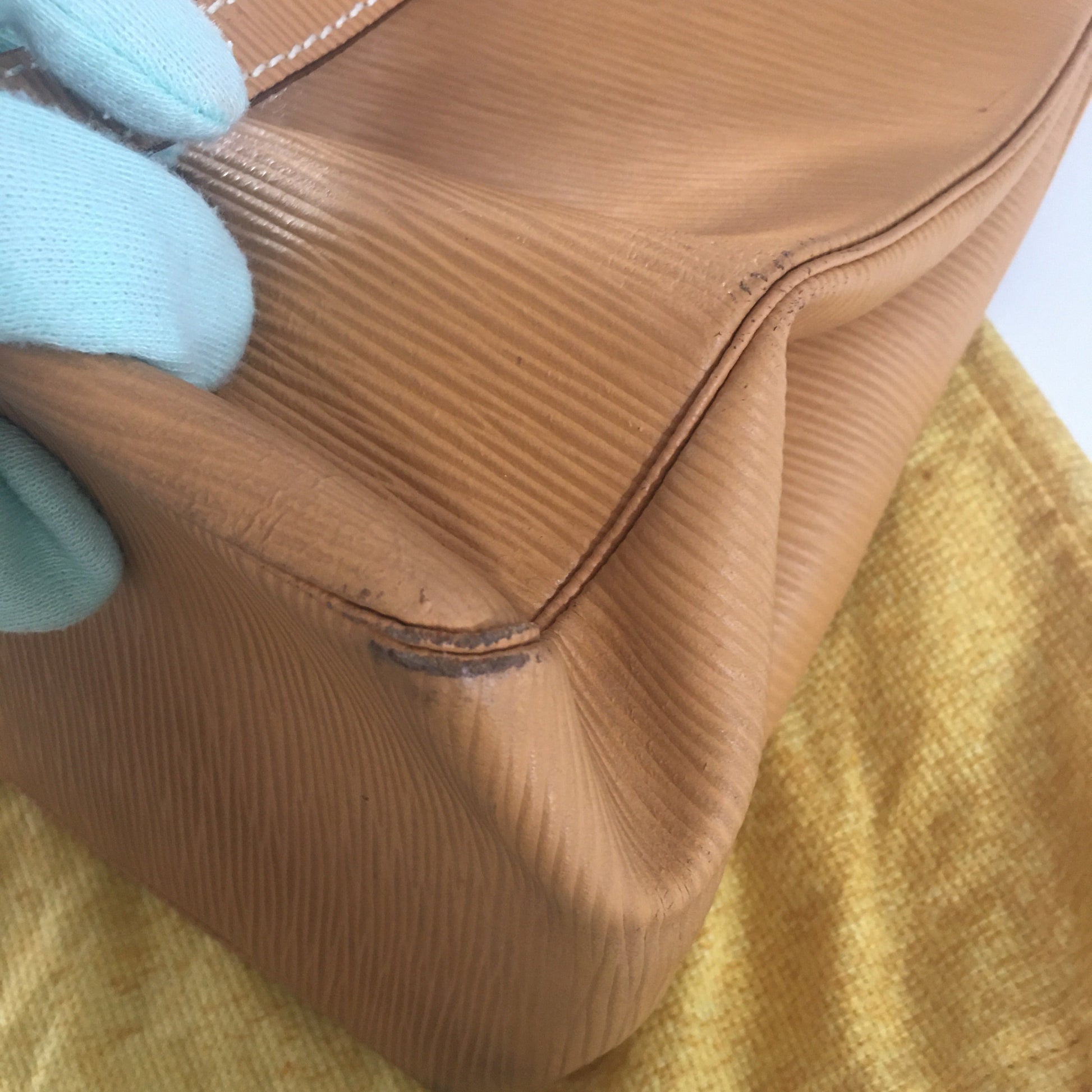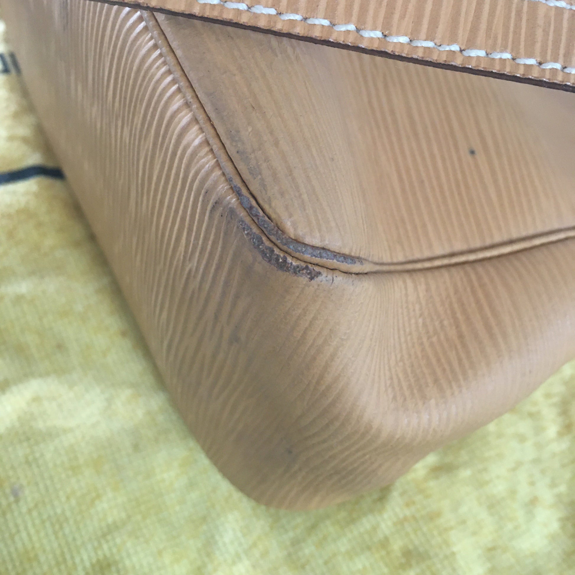 Corners are dark and scratched; the Epi leather, which has a typical rigidity, is no longer structured and, on the handles, the material is dry
