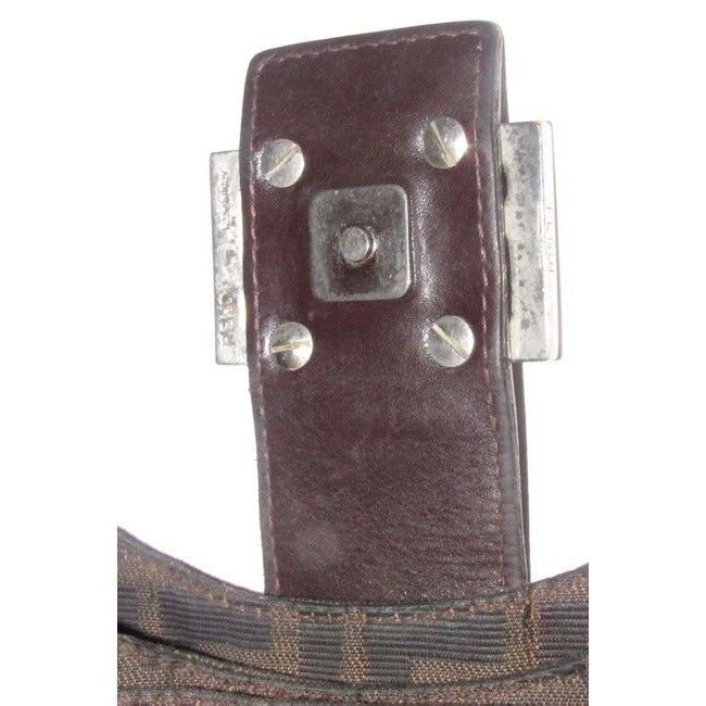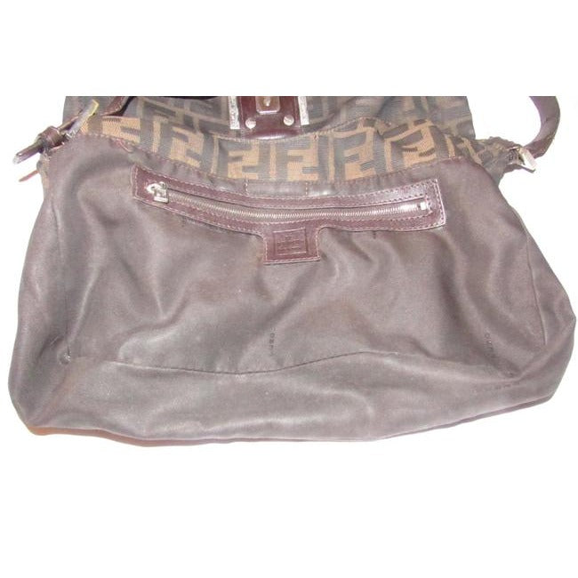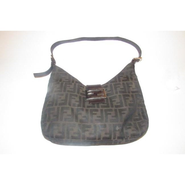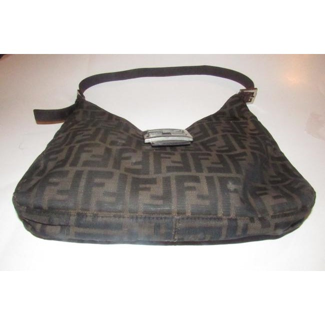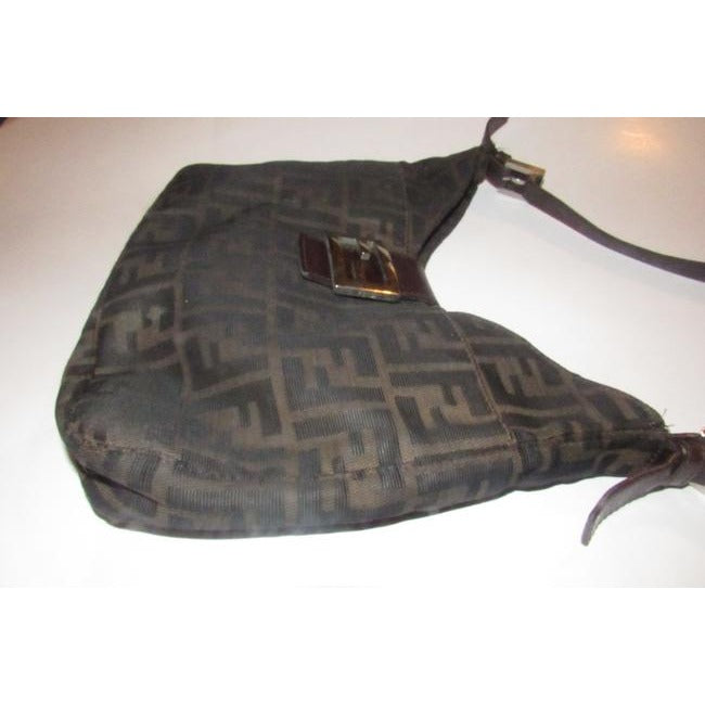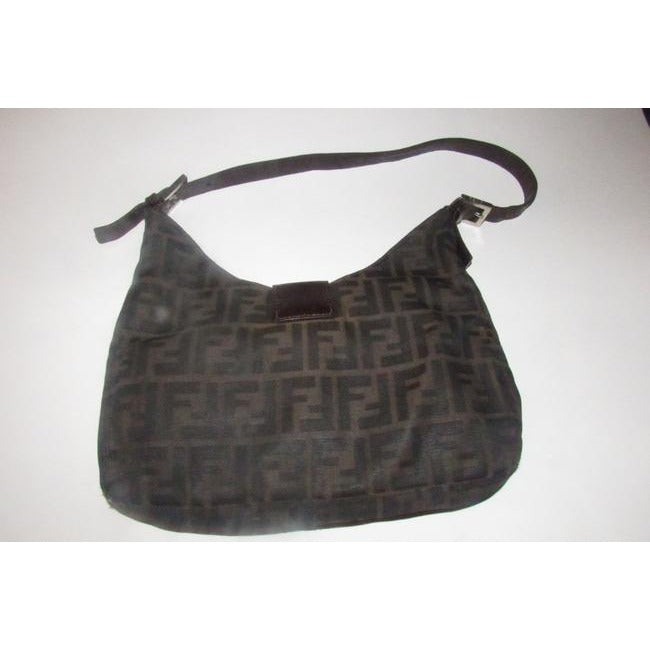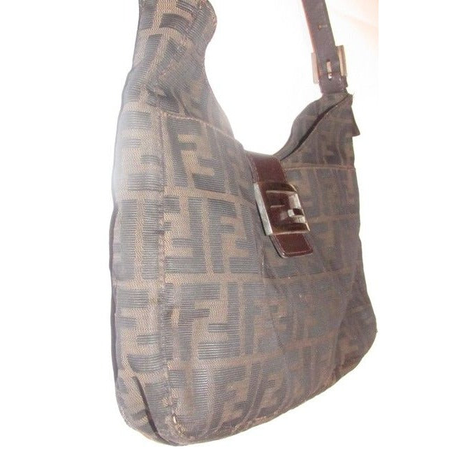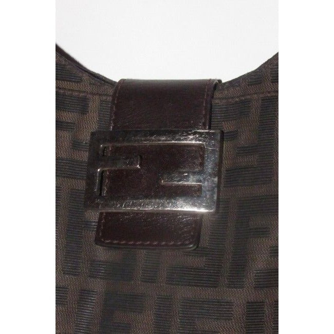 This bag is made of tobacco Zucco print or large F logo print canvas and brown leather with chrome accents. It is a hobo style shoulder bag with a deep 'V' at the center where the brown leather strap with the chrome FF snap close logo secures. There is an exterior pocket at the front. It has an adjustable leather strap, engraved chrome hardware, and is in excellent condition- don't miss out!