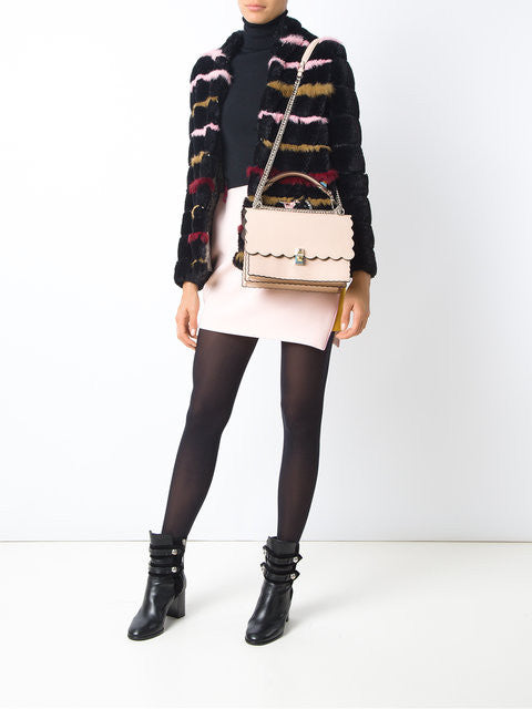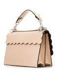 This light nude calf leather Kan I scalloped handbag from Fendi features a foldover top with flip-lock closure, a top handle, a chain and leather strap, interior compartments divided by a partition and silver tone hardware. Bag with flap and two-tone plexiglass double stud fastening. The gusseted interior features a pocket and two compartments divided by a stiff partition. Can be cross-body or carried by hand thanks to the detachable shoulder strap. Made of light nude leather with silver metal hardware. Contrasting painted scalloped edging.