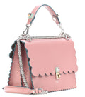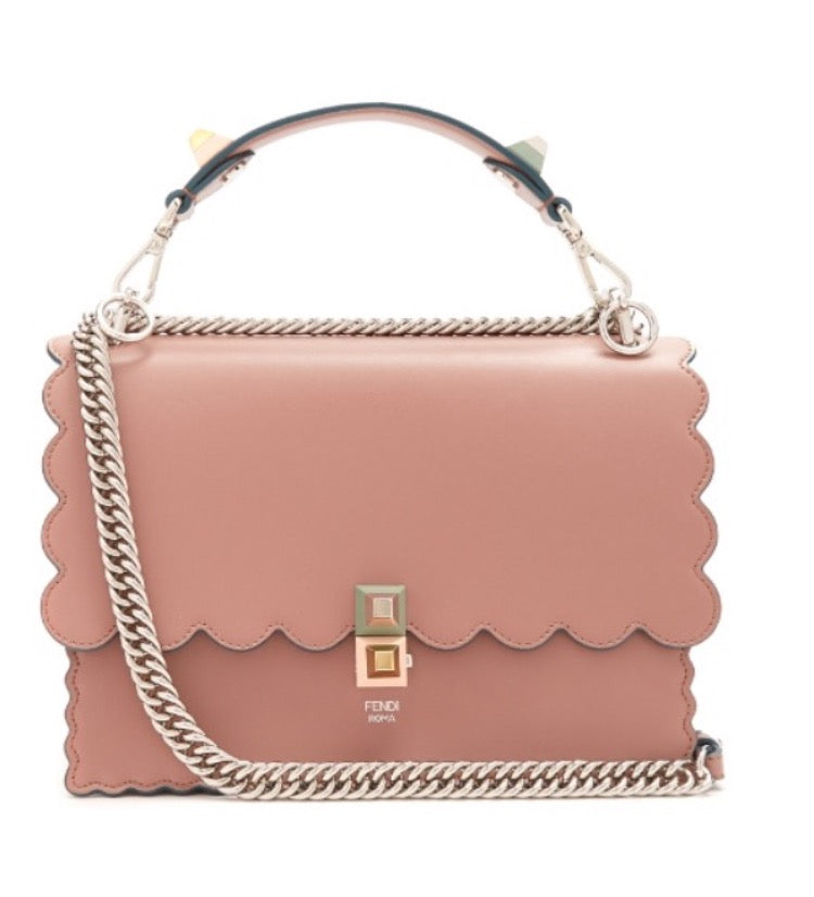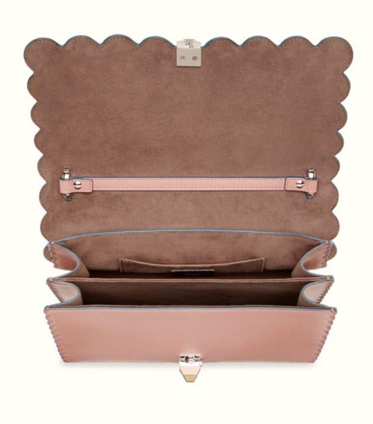 This English rose nude calf leather Kan I scalloped handbag from Fendi features a foldover top with flip-lock closure, a top handle, a chain and leather strap, interior compartments divided by a partition and silver tone hardware. Bag with flap and two-tone plexiglass double stud fastening. The gusseted interior features a pocket and two compartments divided by a stiff partition. Can be cross-body or carried by hand thanks to the detachable shoulder strap. Made of nude pink leather with silver metal hardware. Contrasting painted scalloped edging.
