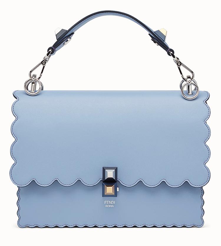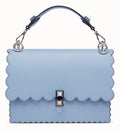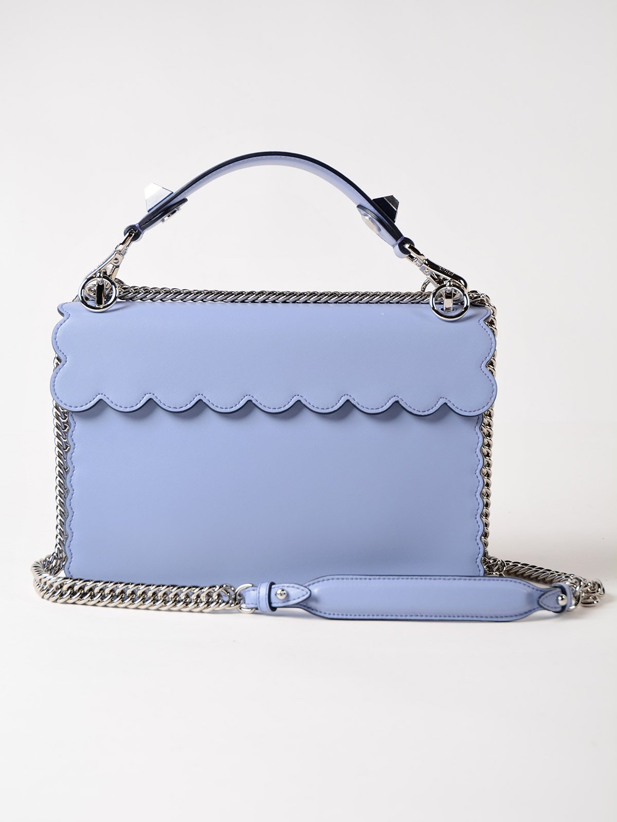 This baby blue calf leather Kan I scalloped handbag from Fendi features a foldover top with flip-lock closure, a top handle, a chain and leather strap, interior compartments divided by a partition and silver tone hardware. Bag with flap and two-tone plexiglass double stud fastening. The gusseted interior features a pocket and two compartments divided by a stiff partition. Can be cross-body or carried by hand thanks to the detachable shoulder strap. Made of light blue leather with silver metal hardware. Contrasting painted scalloped edging.