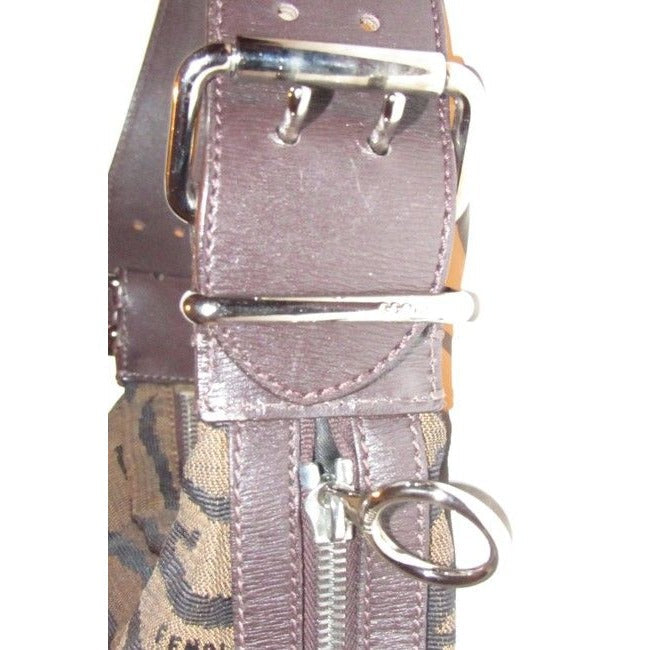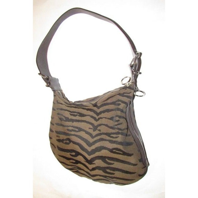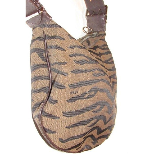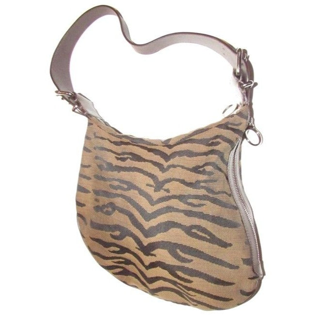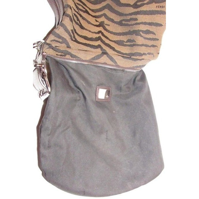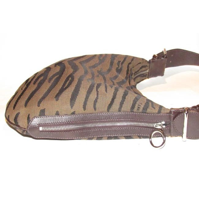 The bag is the perfect, organic shaped, Fendi small hobo that no one else will have! The purse is a larger size based on all it can hold! It is made of brown and black tiger print canvas and brown leather. It has a leather strap that can be adjusted and chrome hardware! It has an exterior pocket on the side and all of the zipper pulls and buckles are engraved 'FENDI'.