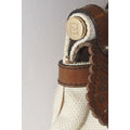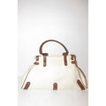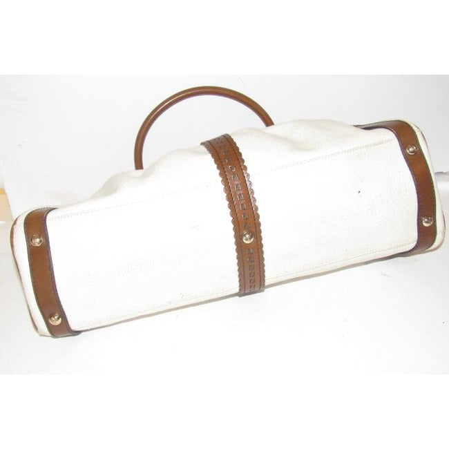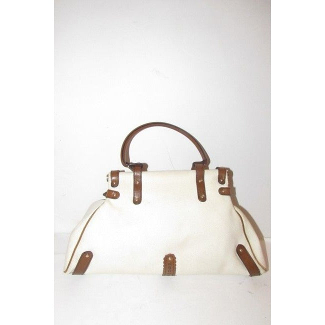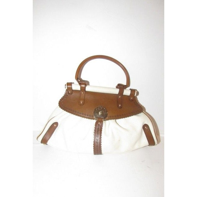 I think this style by Fendi is called a 'Magic Hat' style. The bag is an extra large, unique, top handle, satchel style purse. It is made of an ivory heavy canvas fabric and brown leather with the 'FF' logo design embossed or tooled throughout the edges. The purse has a brown leather, top handle strap and twist lock closure with a gold, Fendi cut-out accent.