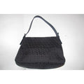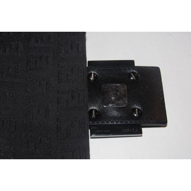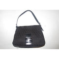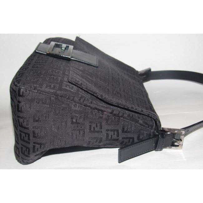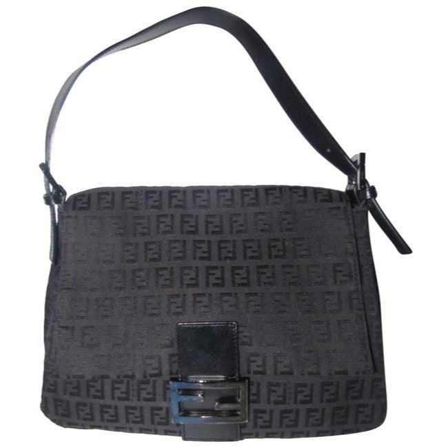 I think this style by Fendi is called a 'Mamma Zucco'. The bag is a medium/ large, classic, shoulder style purse in a black small 'FF', logo design. The purse is made from black fabric and leather with chrome accents. The clasp is the traditional chrome 'FF' style and all of the hardware is engraved 'FENDI'.