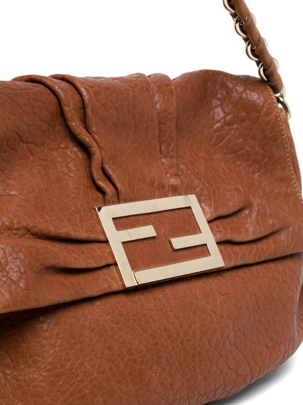 Cognac brown calf leather Ruched detailing Iconic FF logo plaque Leather and chain-link shoulder strap Foldover top with magnetic fastening Internal zip-fastening pocket & slip pocket to the rear Gold-tone hardware Very Good Condition: signs of wear on corners and scratches on hardware.