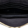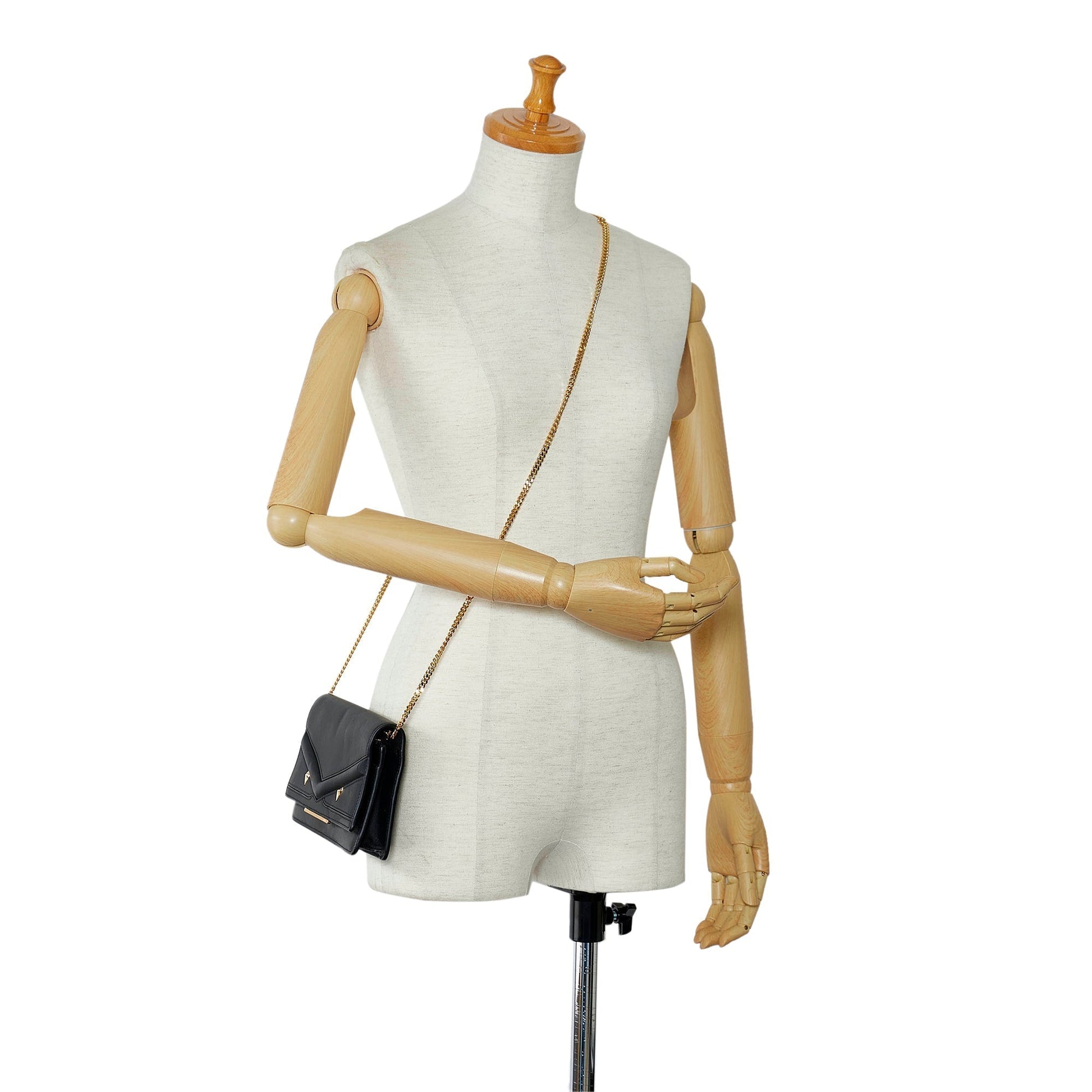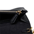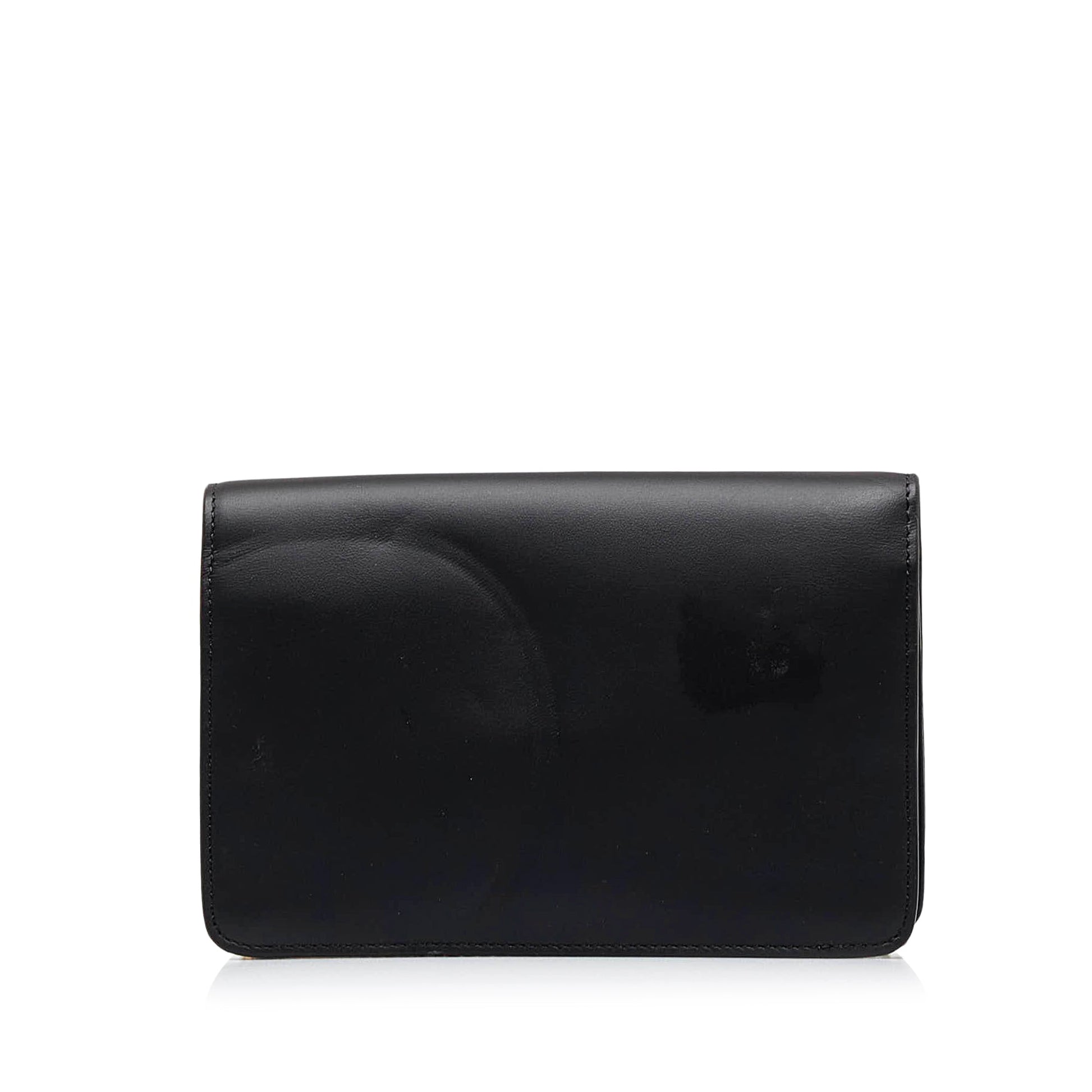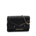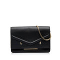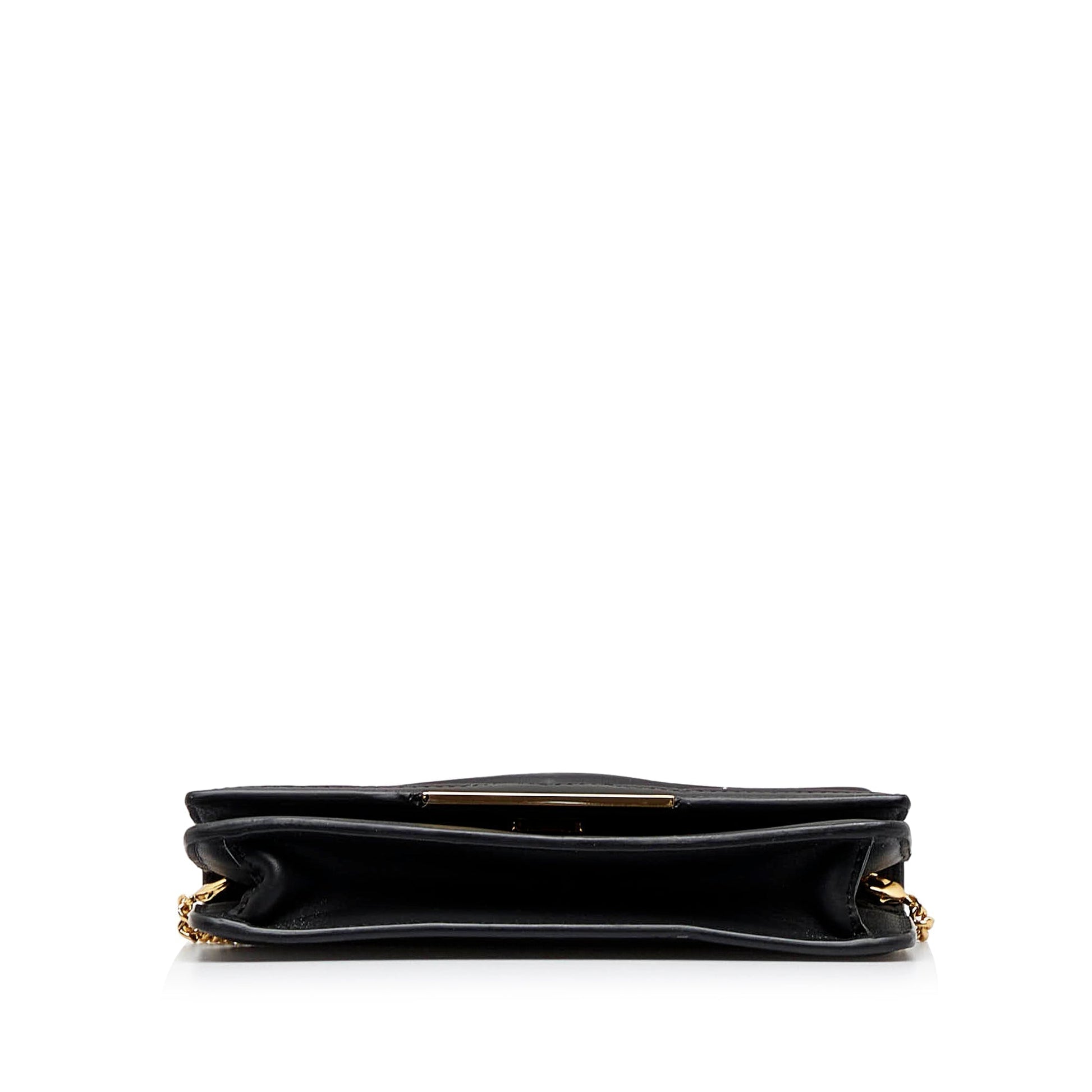 This wallet on chain features a leather body, a gold-tone chain strap, a front flap with a magnetic snap button closure, and interior zip and slip compartments.