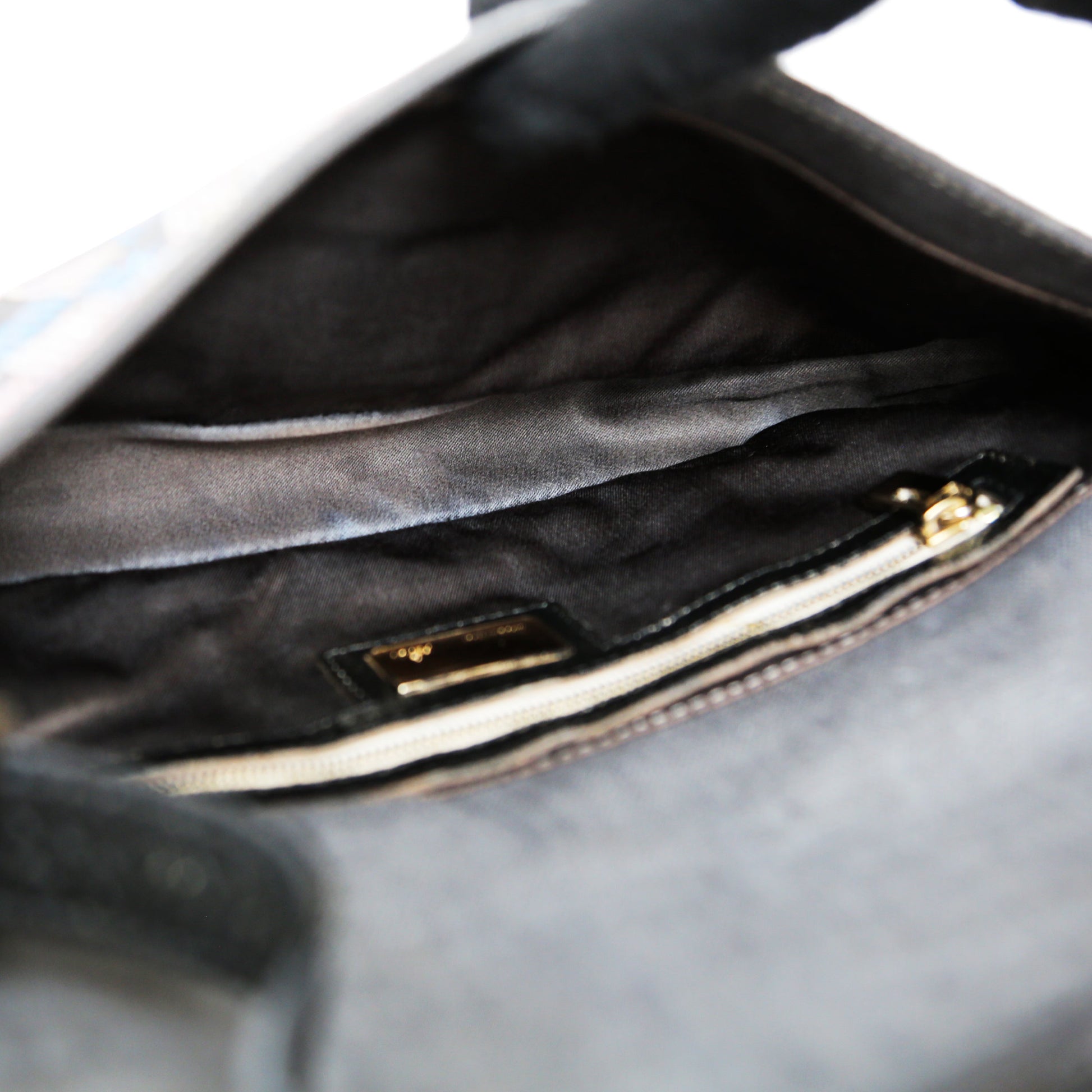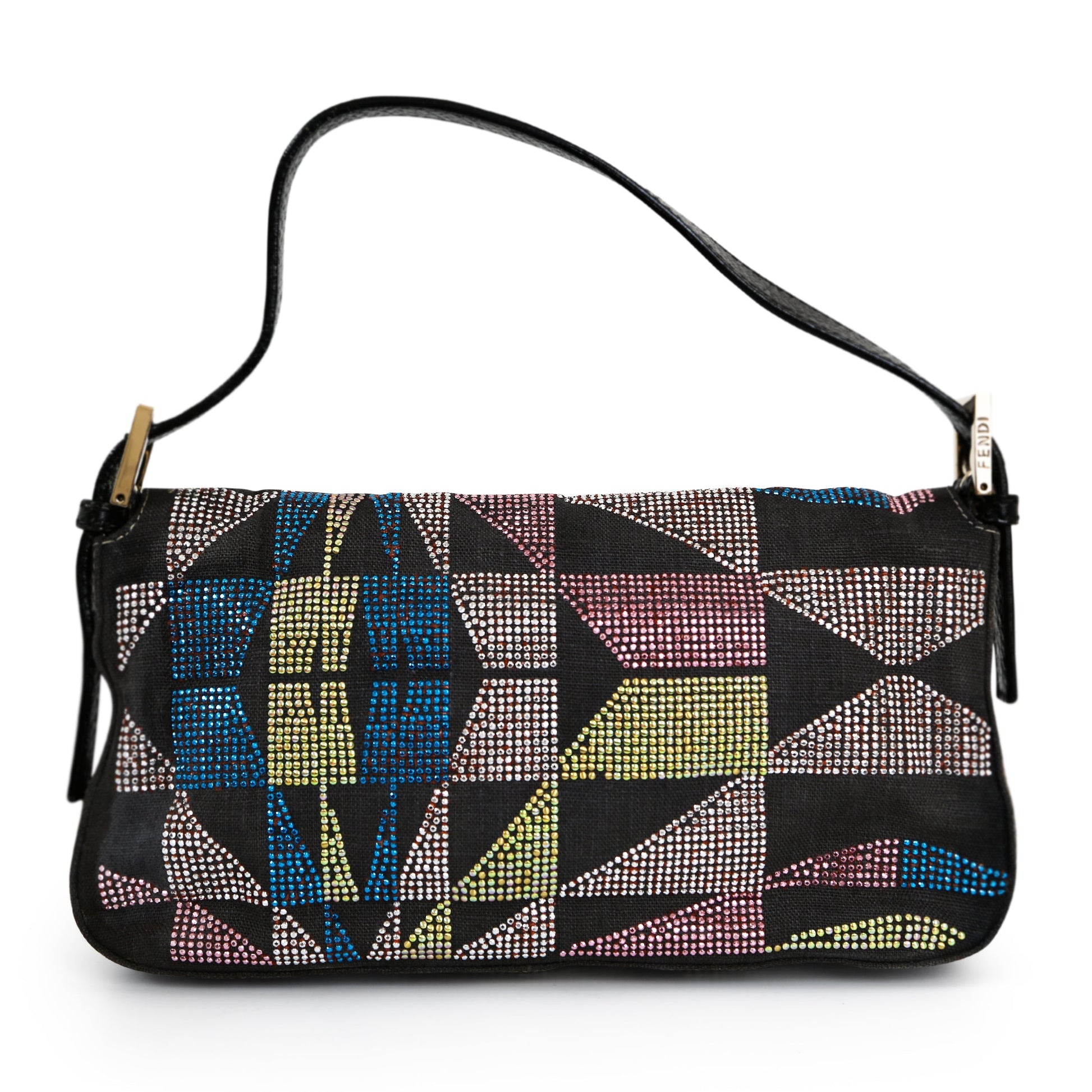Denim baguette body Multicolor glitter strass embellishment FF logo plaque Golden hardware 100% silk lining 100% leather trims Fold-over top with magnetic fastening Spacious main compartment Inside zipped pocket.