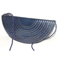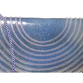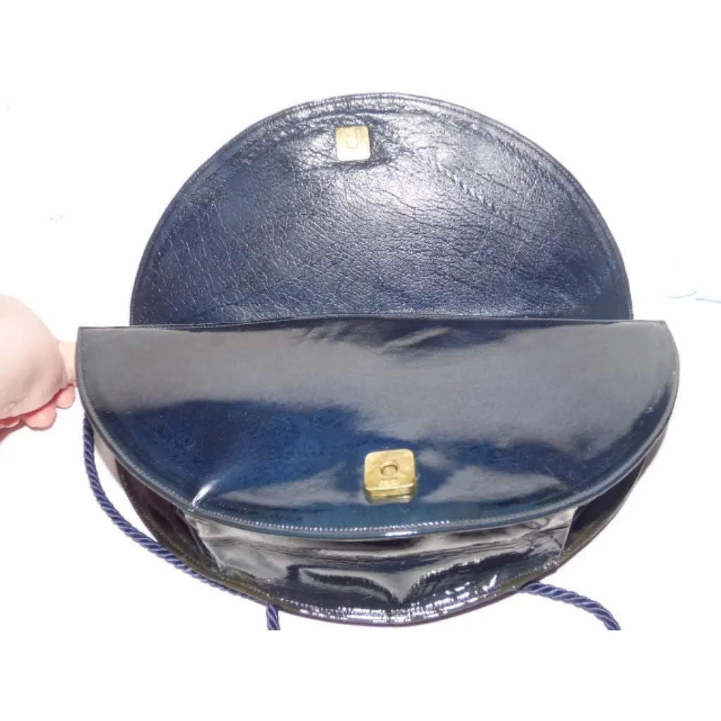 It is made from a navy blue lacquered patent leather that is a circle when opened with a stitched, linear design on the front. It folds and snaps to close. The removable strap is a thick, silk corde material with a snap to fasten it.