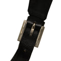 This shoulder bag features a nylon body, flat leather straps, an open top with magnetic snap button closure, and an interior zip pocket.
