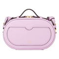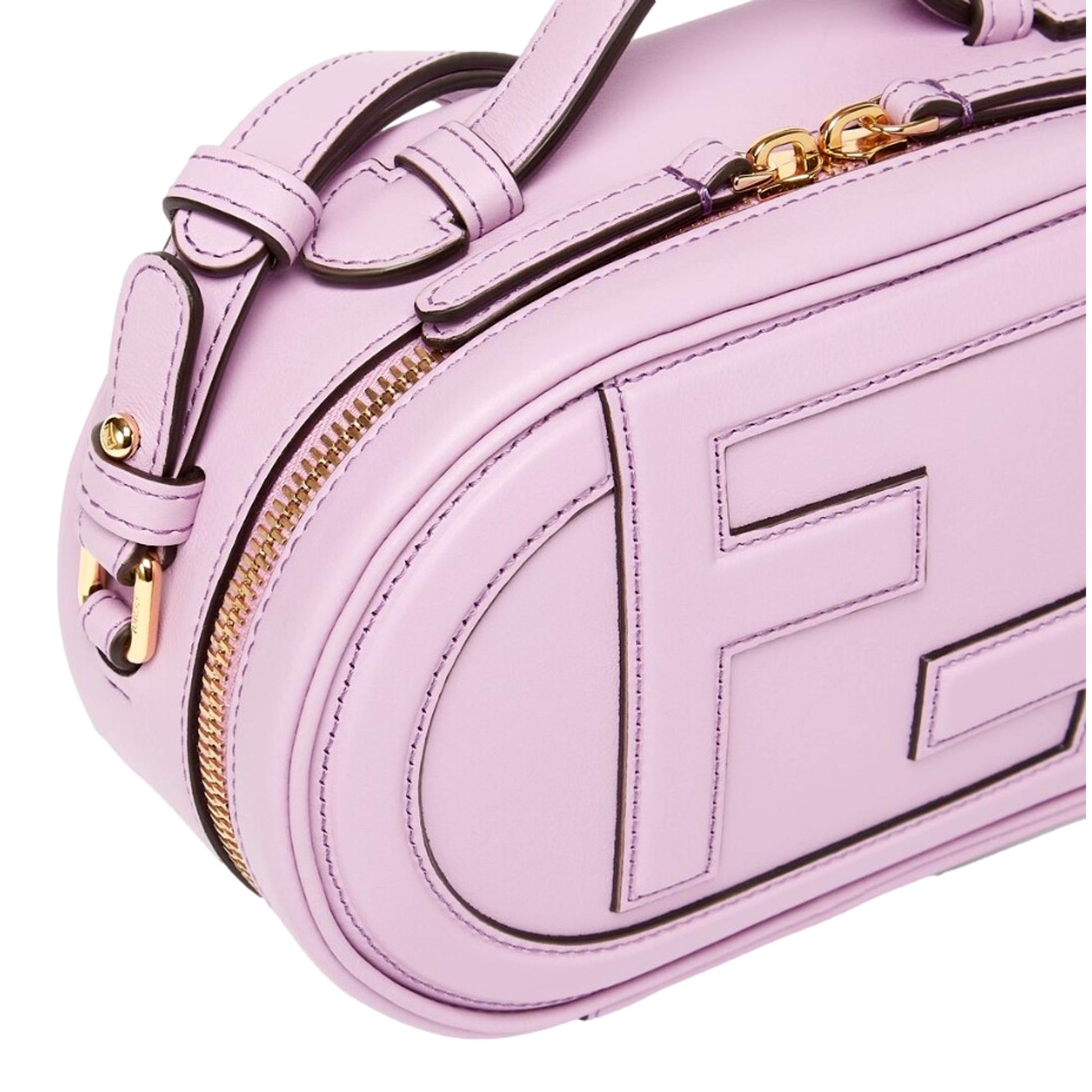 This oval shaped mini bag is crafted with lilac calfskin leather and features the iconic FF motif shape on the front face. The gold-tone double zippers open to a spacious canvas lined interior compartment. Versatile in styling options, it includes a detachable and adjustable crossbody strap and top handle. Make a chic and stylish impression with this piece from Fendi.
