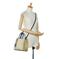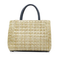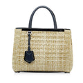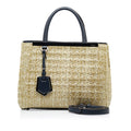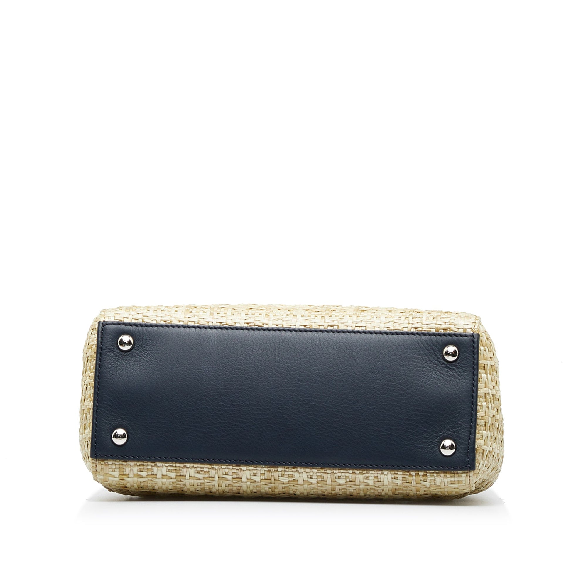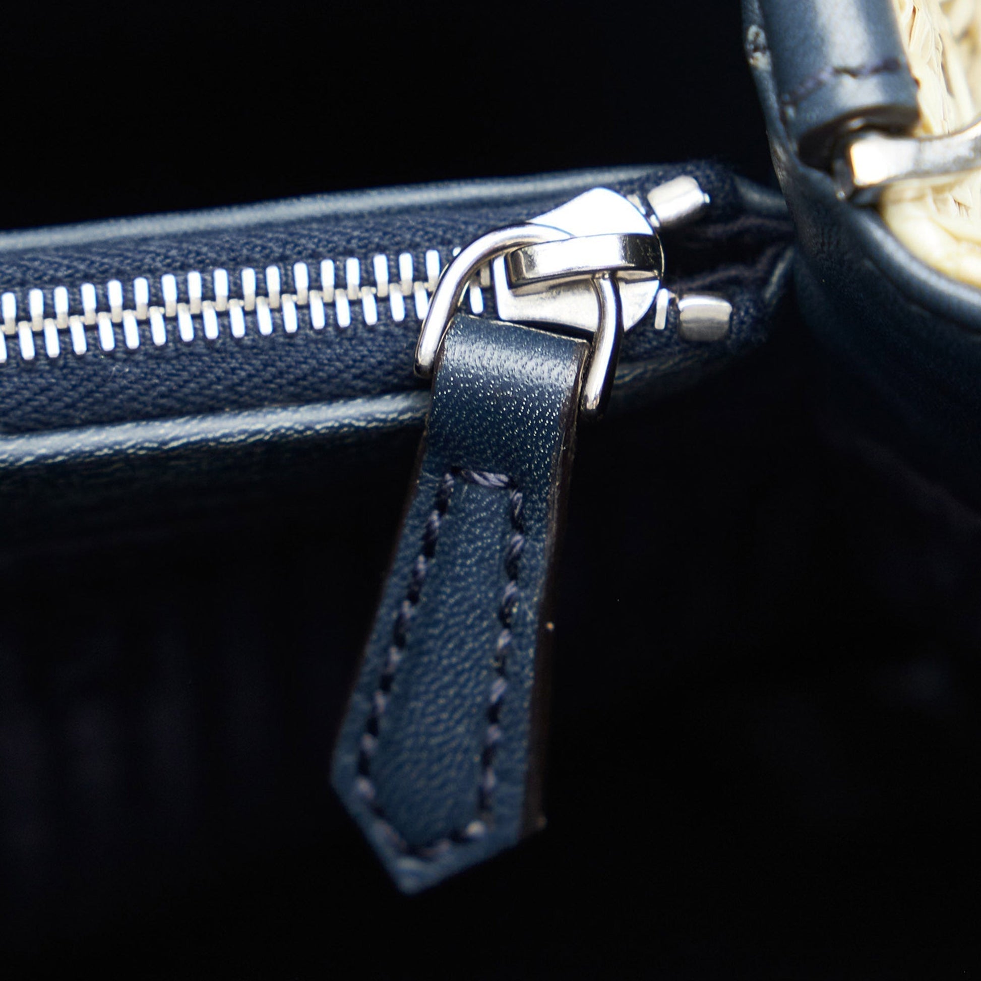 The Petite 2Jours features a woven raffia body, rolled leather handles, detachable flat strap, a snap button closure, and an interior zip compartment.