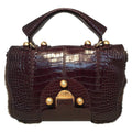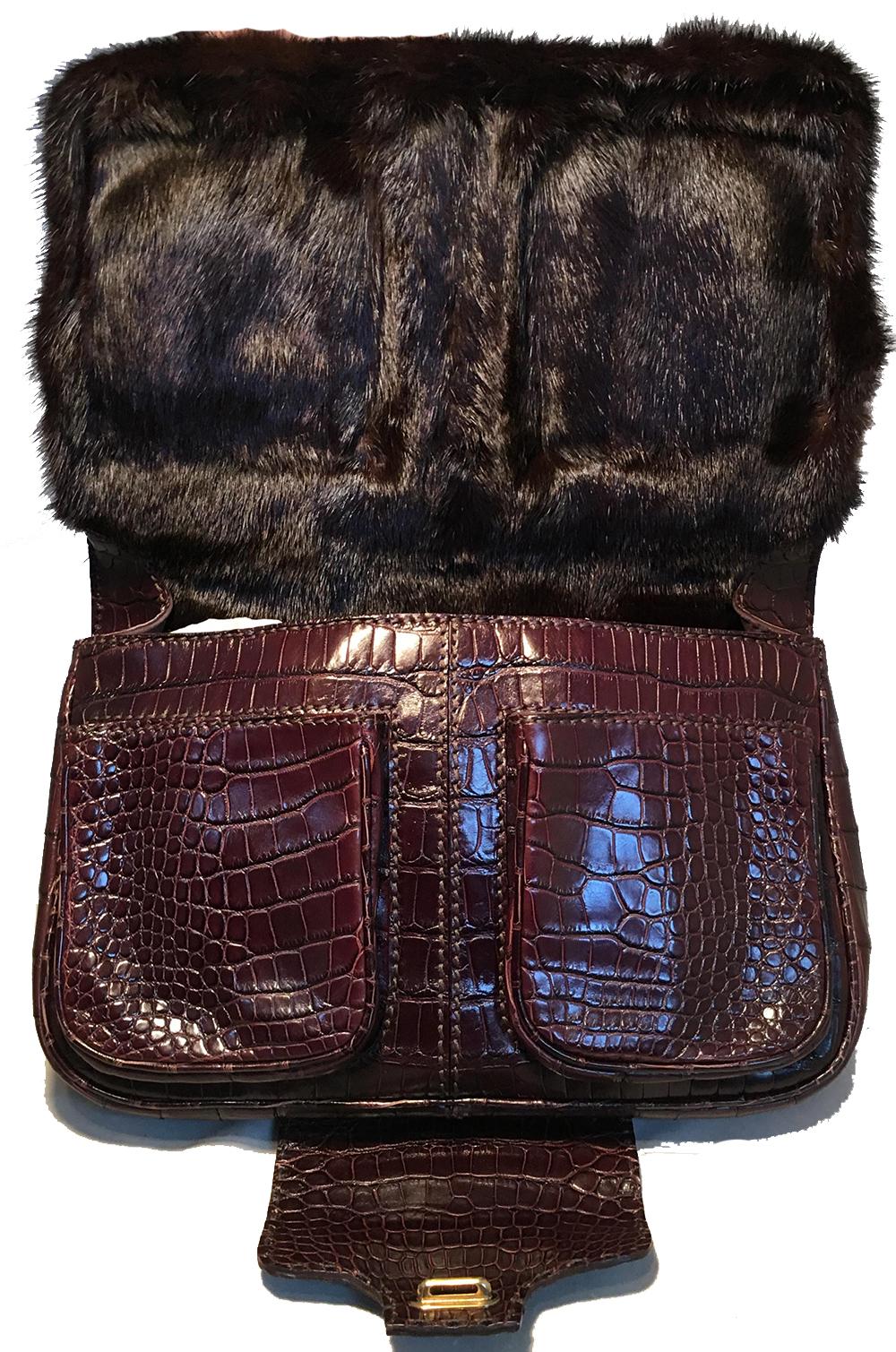Brown alligator leather exterior trimmed with brown mink fur and brushed gold hardware.