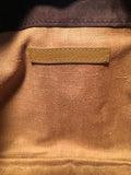 Front latch flap closure opens to 2 side slit pockets and an interior lined in tan linen that holds one side slit pocket.