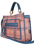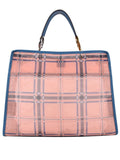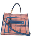 Made of technical mesh bag has plaid print on pink mesh material with blue leather details. It has a removable flat top handle and flat shoulder strap.
