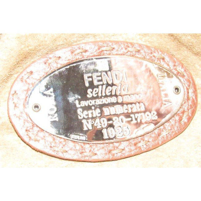 Inside, it has one main compartment with an interior pocket. The lining is light brown suede fabric and it is very clean. There is an early sterling silver selleria plaque at the back that reads, 'Fendi, selleria, lavorcrazione a mano, Serie numeraia 49 20 17192, 1925'.