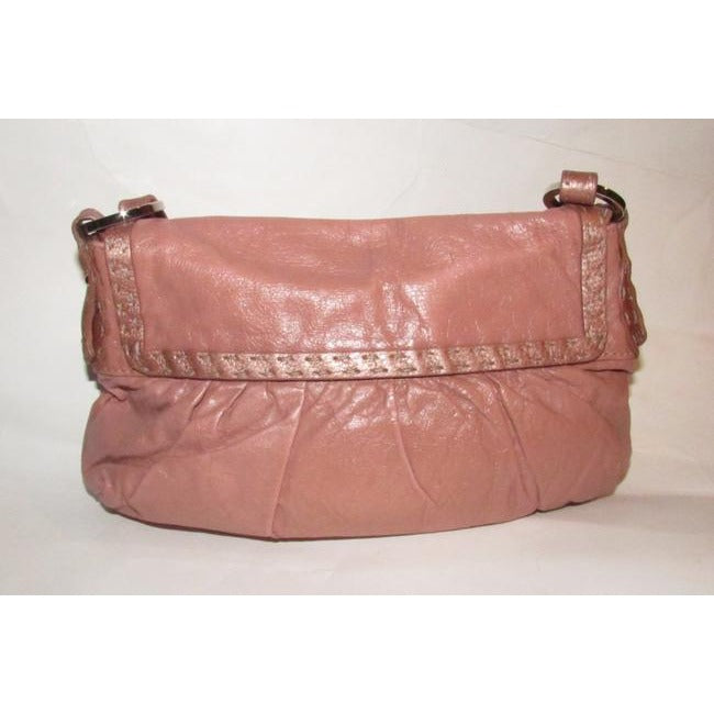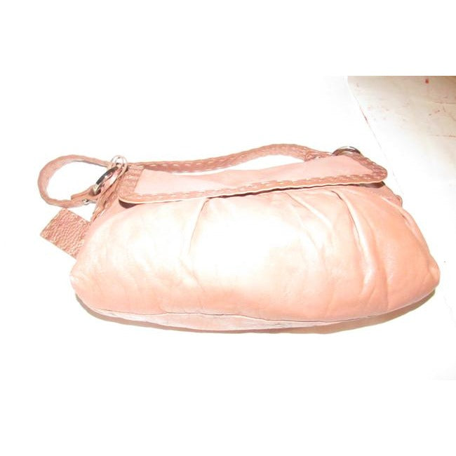 This style by Fendi is called a Chef style hobo shoulder bag and it is made with Fendi's super supple Selleria leather. The bag is a medium/ large, classic, shoulder style purse with an envelope flap top snap closure. It is made of the super soft, Fendi 'Selleria' leather in supple mauve pink leather with metallic matching pink trim with whip-stitched design in taupe contrast stitching. It has a leather fob that reads, 'FF Fendi Selleria' on one side.